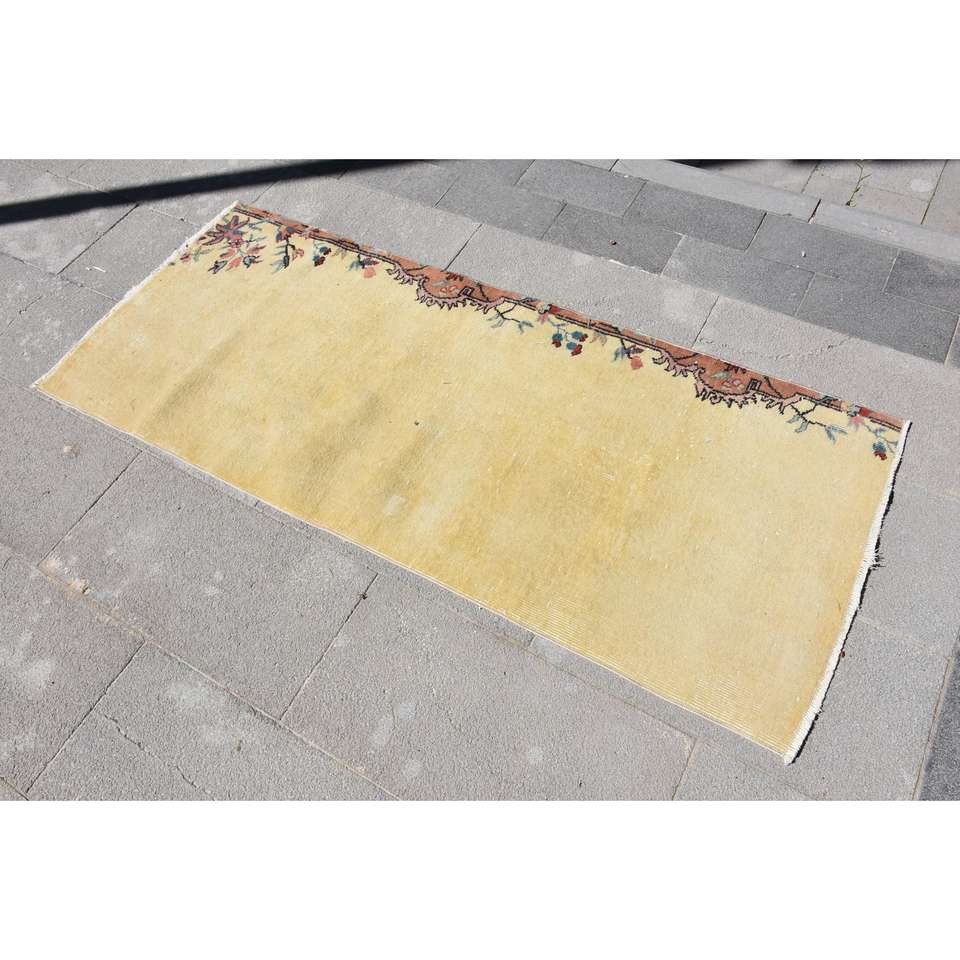พรมวินเทจตุรกีขนาดเล็ก 2.3x5.5 ฟุต (71x168 ซม.) พรมขอบสีเหลือง