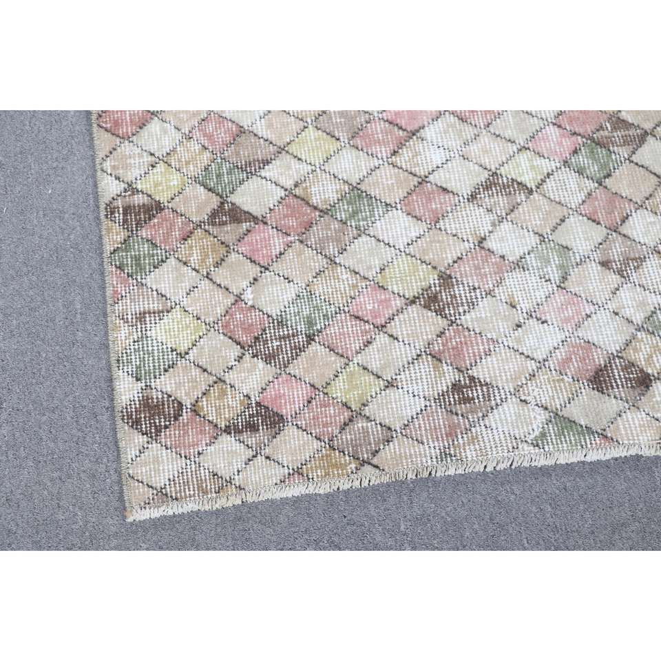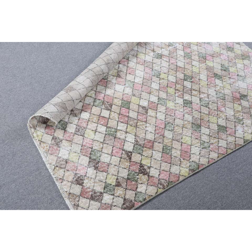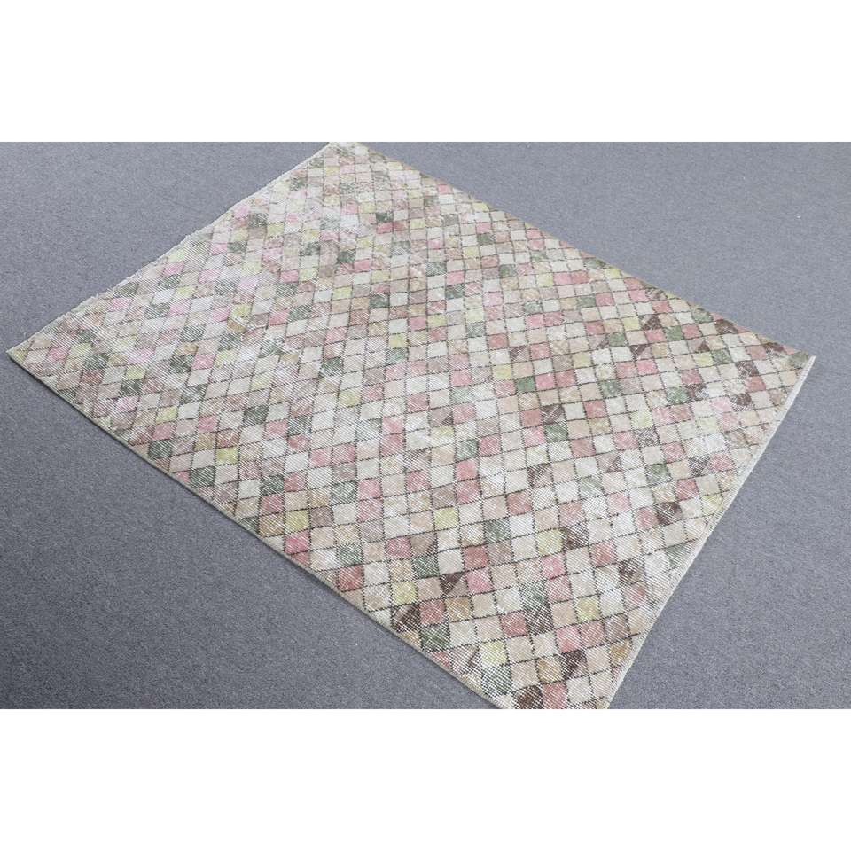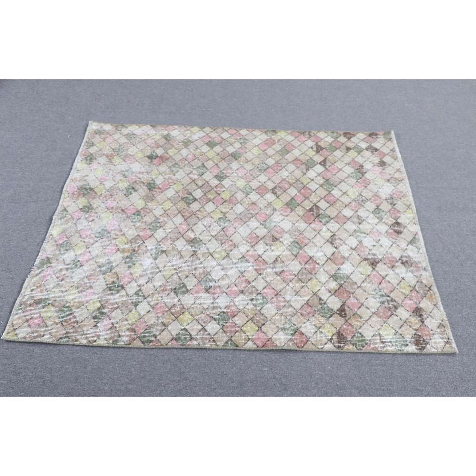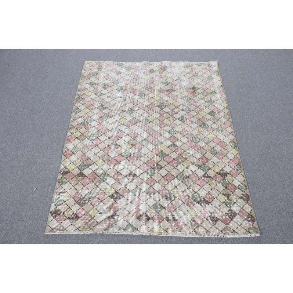พรมวินเทจตุรกีขนาดเล็ก 3.4x4.3 ฟุต สีชมพู พรมขนสัตว์สีพื้น