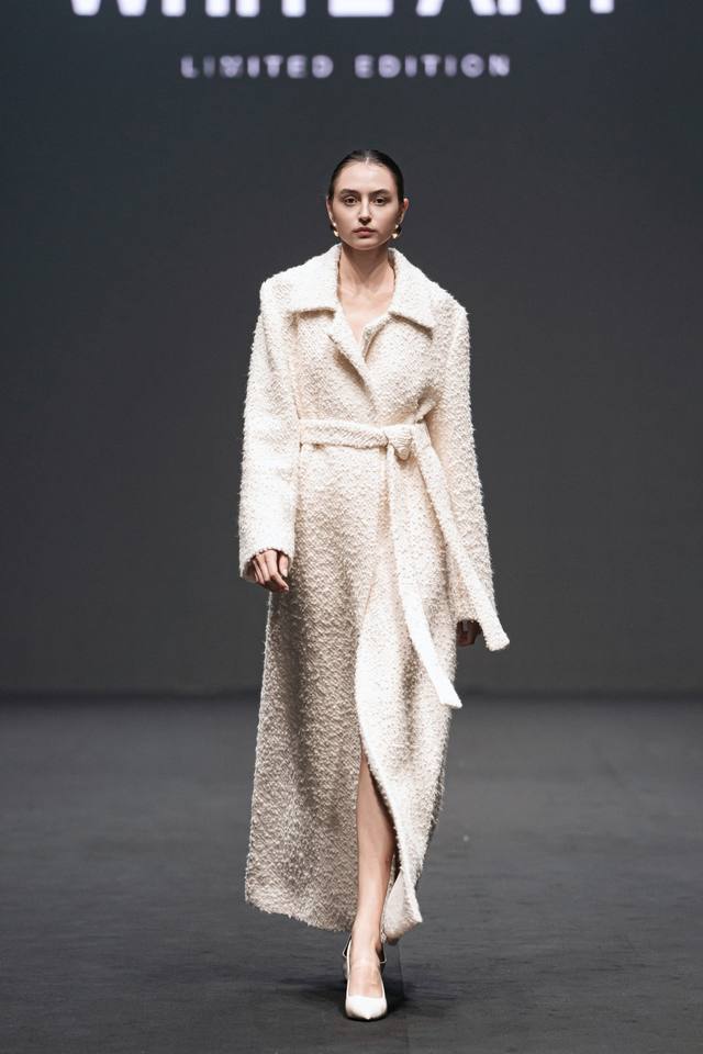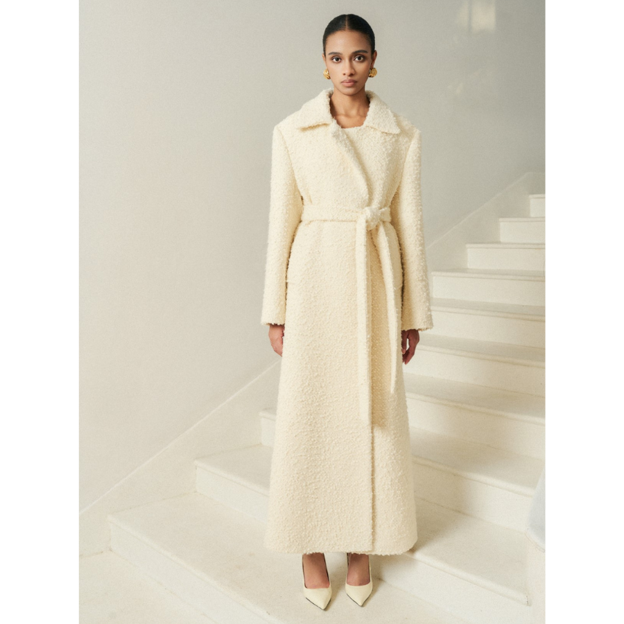 เสื้อโค้ทผู้หญิงแบบเปิดลงคอปกมีกระดุมด้านหน้าผ้าขนสัตว์ผ้าขนสัตว์สีขาวผ้าทวีตผสมกับสายรัดเสื้อผ้าผู้หญิงสีขาวมดเวียดนาม