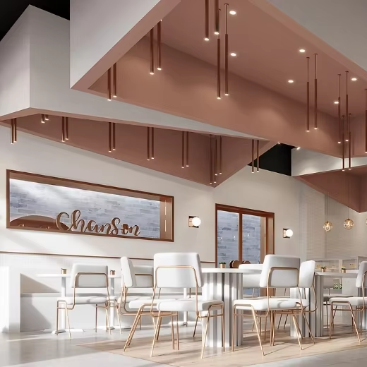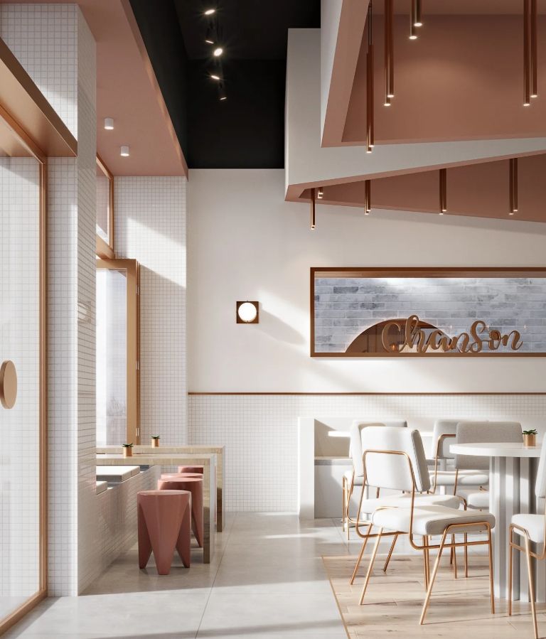 การออกแบบตกแต่งภายในแบบครบวงจรสำหรับร้านกาแฟเบเกอรี่และร้านขนมที่มีการสร้างภาพที่3D การวางแผนพื้นที่และเอกลักษณ์ของแบรนด์