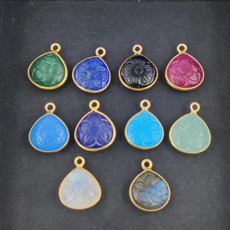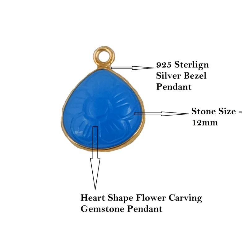 จี้สร้อยคอเทอร์ควอยซ์12มม. รูปหัวใจดอกไม้แกะสลักสีทอง925เวอร์เมลสีเงินสเตอร์ลิงจี้จี้สีฟ้าเทอร์ควอยซ์