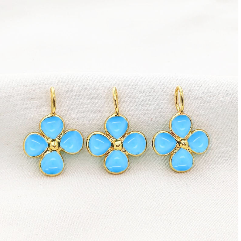 จี้รูปโคลเวอร์สีเทอร์ควอยซ์ ขนาด 5 มม. ขอบโคลเวอร์เรียบ งานแฮนด์เมด ชาร์มเทอร์ควอยซ์ขนาด 7x5 มม. ห่วงชุบทอง ชาร์มเทอร์ควอยซ์