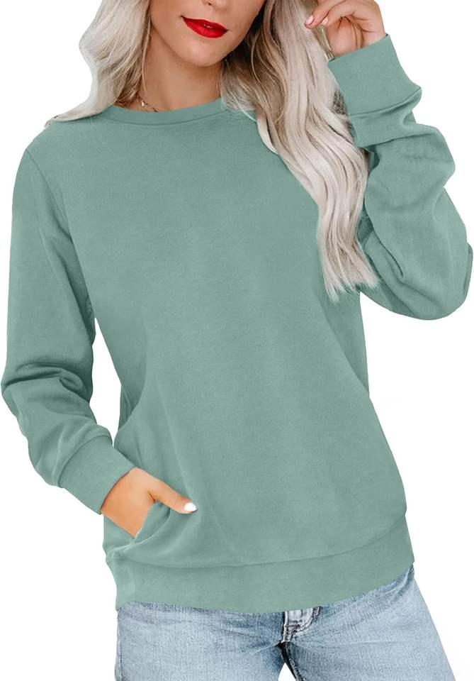 เสื้อสเวตเชิ้ตคอกลมสีเทอร์ควอยซ์สำหรับผู้หญิง แฟชั่น- เสื้อแขนยาวเรียบง่ายมีกระเป๋าสำหรับผู้หญิง