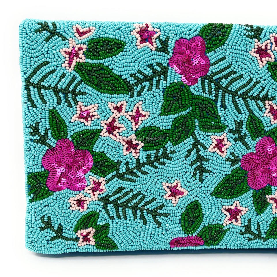 กระเป๋าคลัทช์ลายดอกไม้สีฟ้าครามประดับลูกปัด งานฝีมือปักลายสไตล์โบโฮ กระเป๋าถือสำหรับงานกลางคืน ประดับดอกไม้และลูกปัดเม็ดเล็ก พับได้ ทนทาน ปิดด้วยแม่เหล็ก