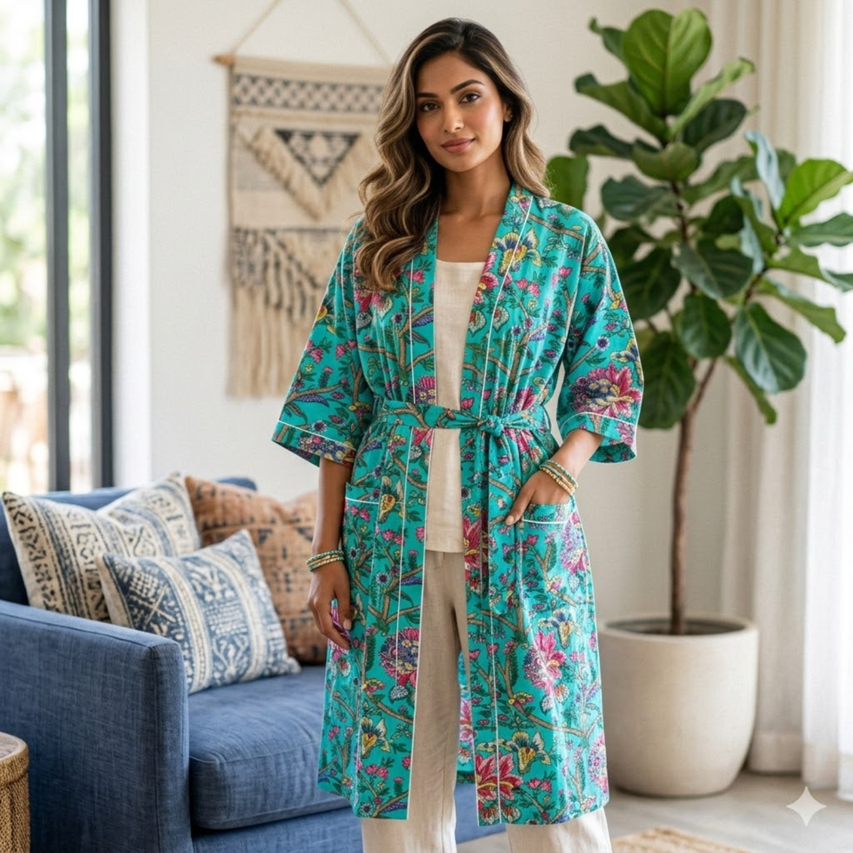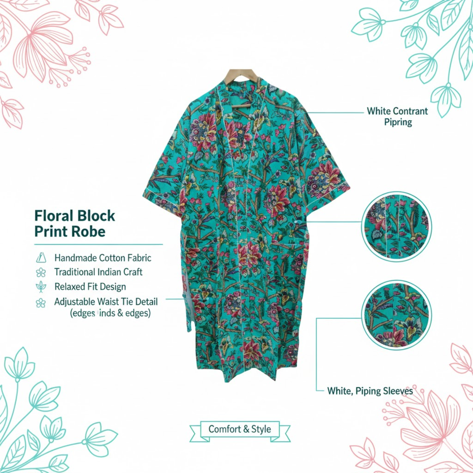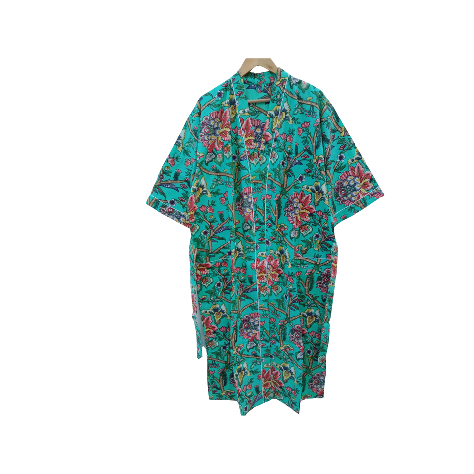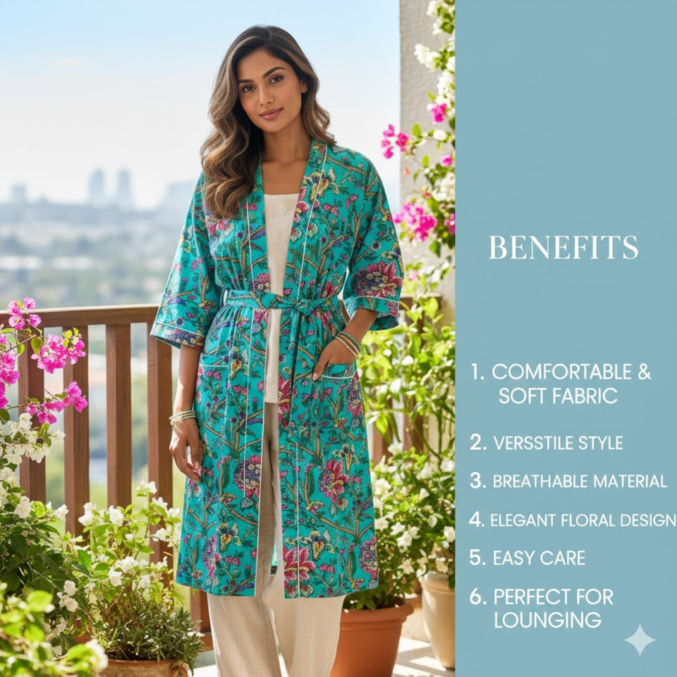 ชุดคลุมกิโมโนผ้าฝ้ายลายดอกไม้สีเทอร์ควอยซ์ ชุดนอนคอวียาวพร้อมกระเป๋ามีเชือกผูก ชุดลำลองแขนยาวสำหรับผู้หญิง ทรอปิคอลมาเรีย