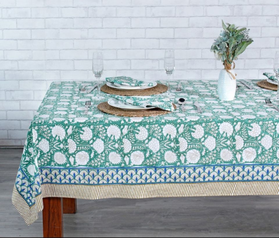 ผ้าปูโต๊ะผ้าฝ้ายพิมพ์ลายมอสมือสีเขียวเทอร์ควอยซ์คลุมโต๊ะ100% ลายดอกไม้งานแต่งงานปรับขนาดได้ตามต้องการ