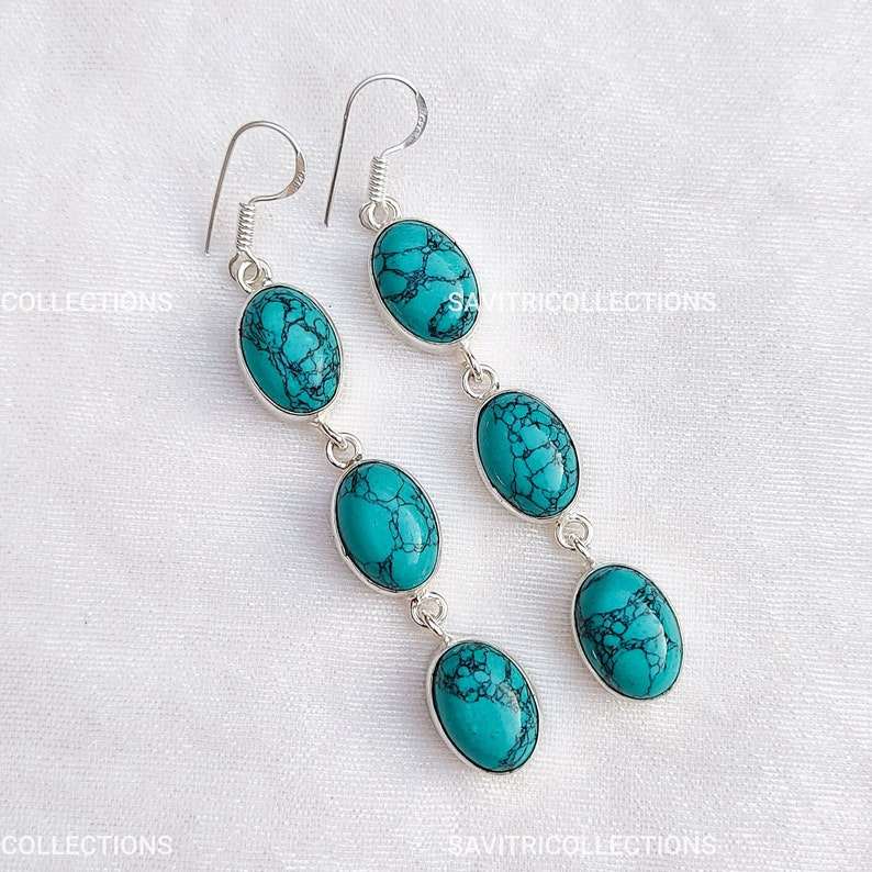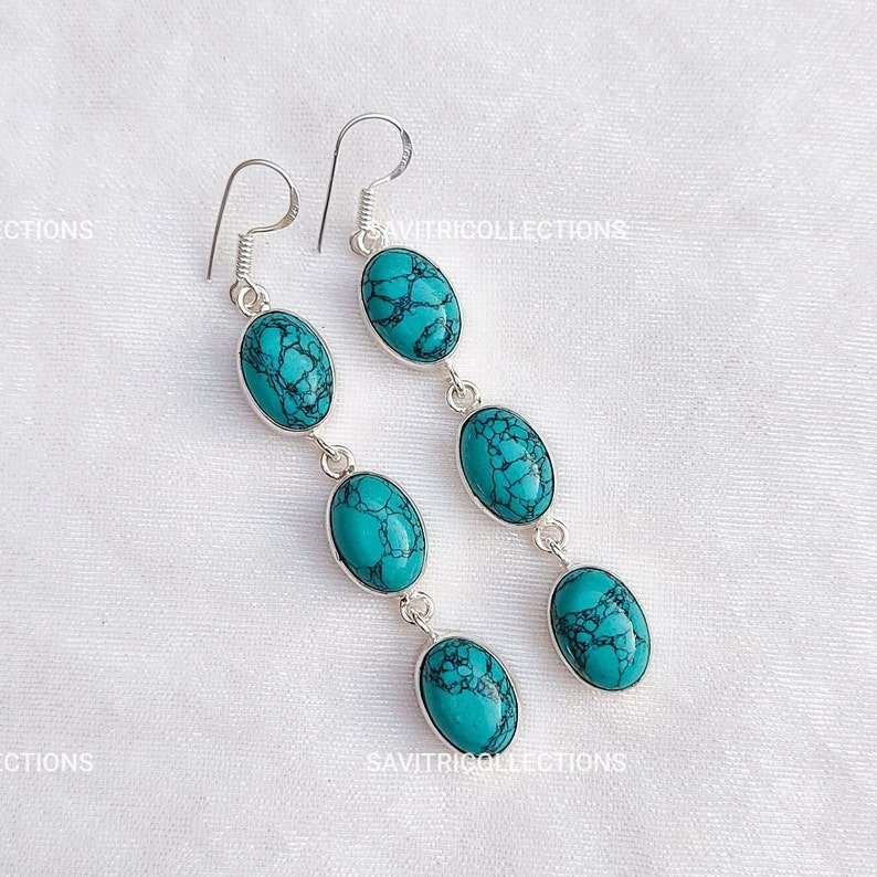 ต่างหูหินเทอร์ควอยส์หลากสี92.5ต่างหูลวดห้อยคริสตัลชุบเงินทำด้วยมือของขวัญเครื่องประดับ Boho สำหรับผู้หญิง