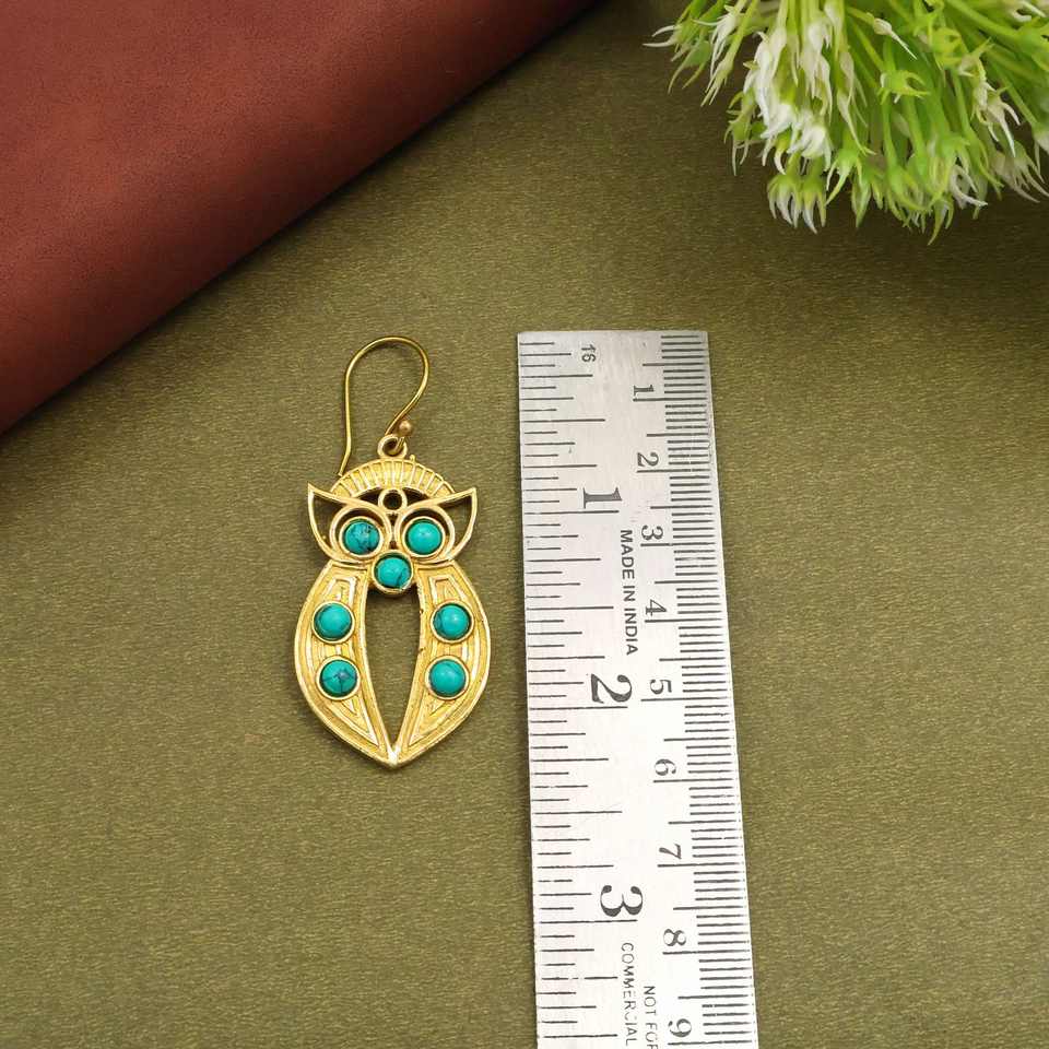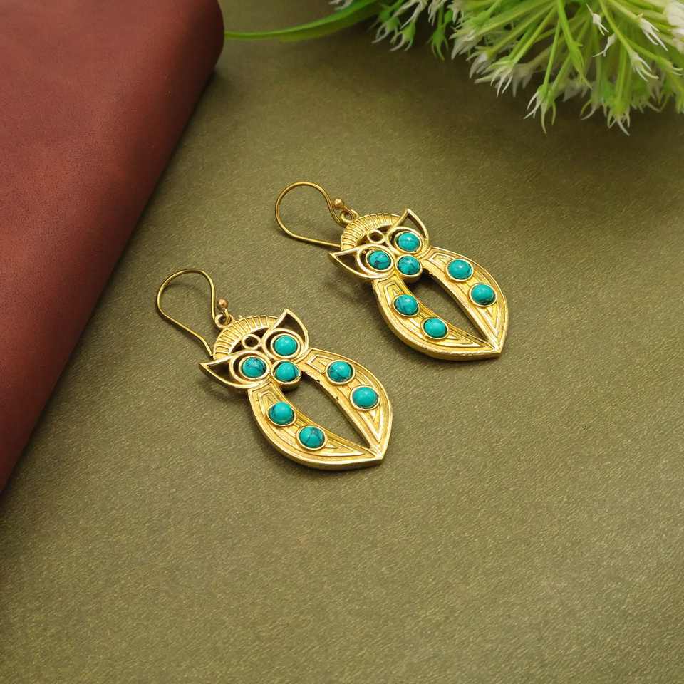 ต่างหูนกฮูกสีเทอร์ควอยซ์ ต่างหูห้อยสีทอง สไตล์โบฮีเมียน เครื่องประดับรูปนก ของขวัญจากธรรมชาติสำหรับเธอ