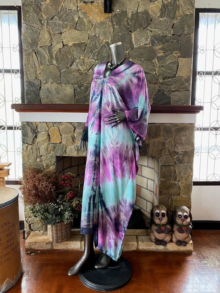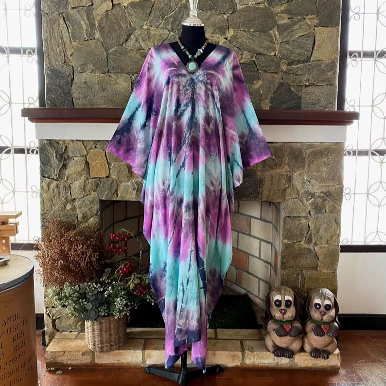 ชุดเดรสคาฟทันผ้าเรยอนย้อมสีเทอร์ควอยซ์แบบชิโบริ ไซส์พลัส สไตล์โบโฮ สำหรับคลุมชุดไปทะเล