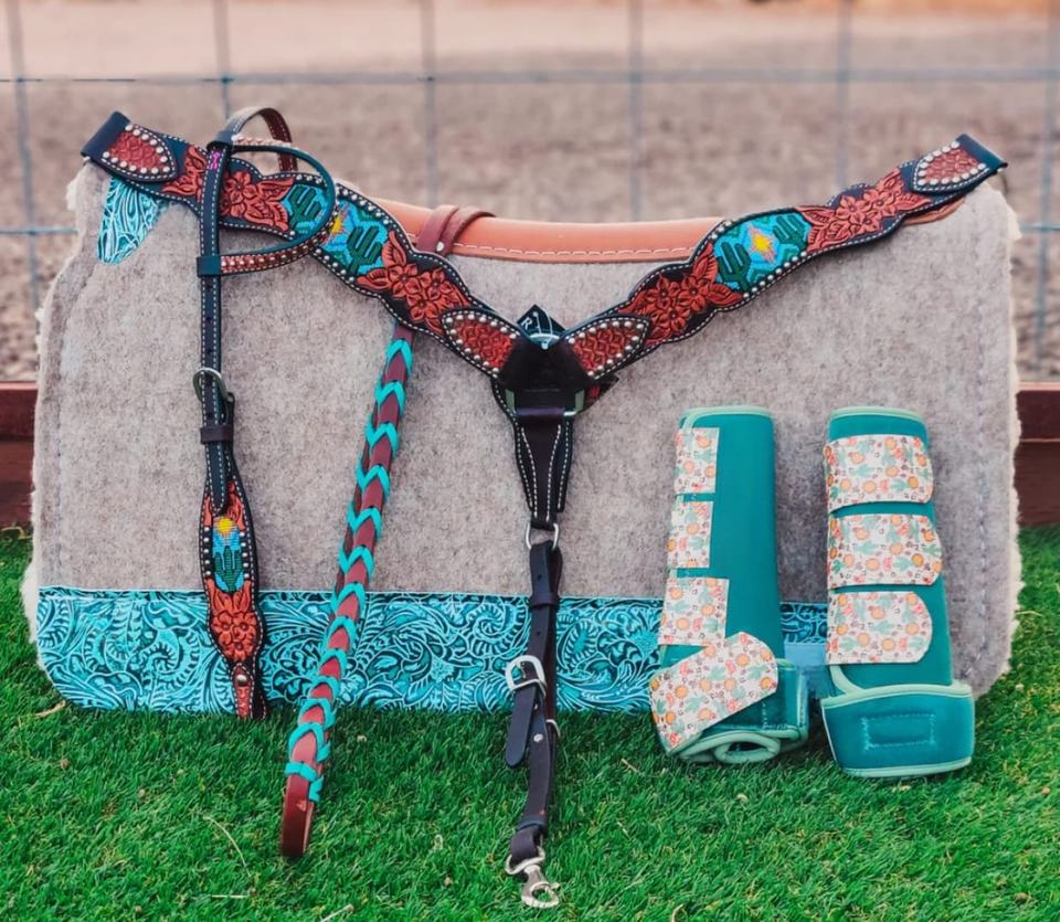 ชุดหมุดม้าหนังแท้ลายกระบองเพชรเทอร์คอยส์พร้อมแผ่นรองศรีษะที่วางอานม้าม้าตามฤดูกาลเซ็ตแบบตะวันตก