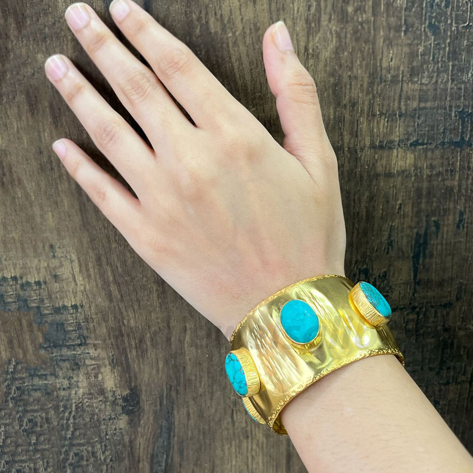 กำไลข้อมือพลอยเทอร์ควอยซ์ขนาดกว้าง18K ชุบทองปรับได้กำไลข้อมืออัญมณีขนาดใหญ่ทำด้วยมือ