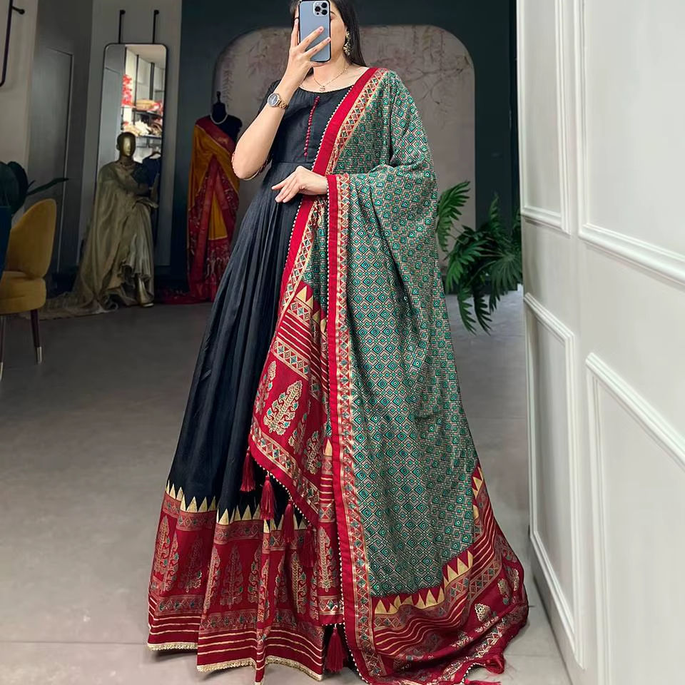 ทัสซาร์ผ้าไหมพิมพ์ลายต้นชาลีฮางก้า choli Garba แบบดั้งเดิมสำหรับงานเลี้ยงฉลองเทศกาลงานเฉลิมฉลองแบบดั้งเดิม