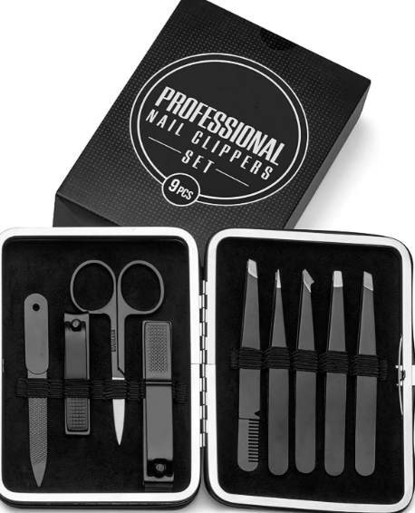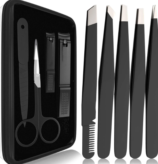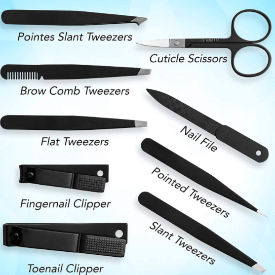 ชุดแหนบสแตนเลสแบบมืออาชีพและกรรไกรตัดเล็บ 9 ชิ้น พร้อมปลายแหลมแบบเหลี่ยม น้ำหนักเบา และกล่องหนังสำหรับพกพาแบบใช้ซ้ำได้