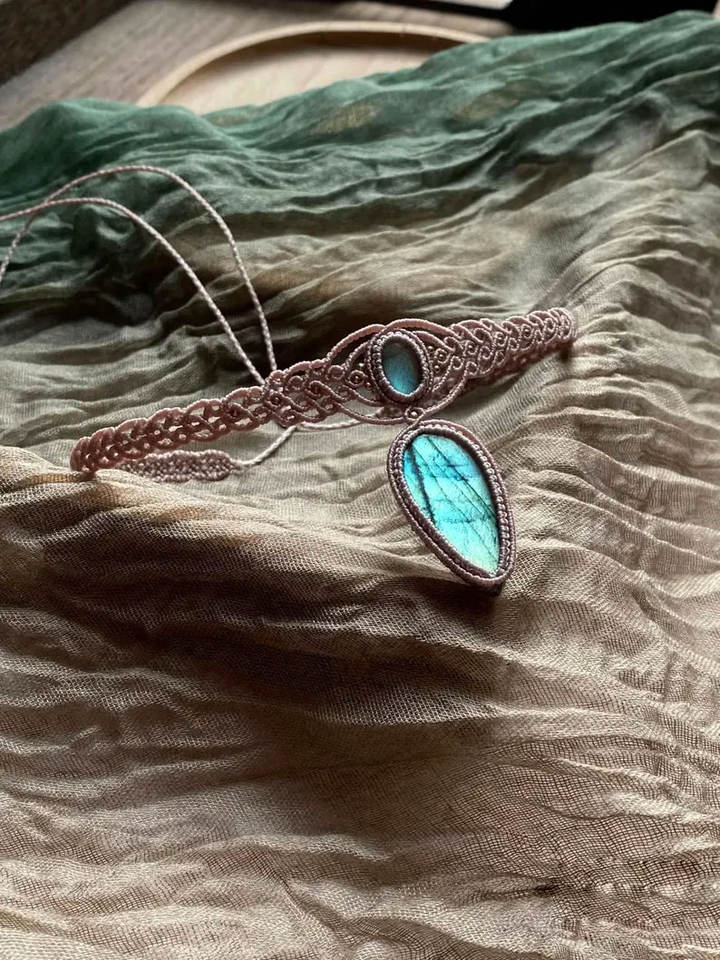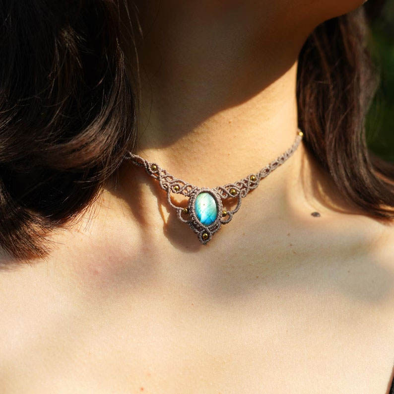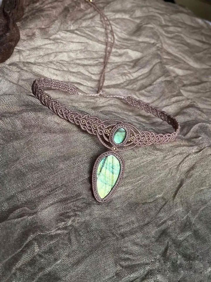 สร้อยคอแฮนด์เมดประดับมุกน้ำจืดคู่สีม่วงเทา ดีไซน์ทันสมัยสไตล์พุทธศาสนา พร้อมเชือกถักแบบมาคราเม่ ประดับด้วยอัญมณีธรรมชาติ