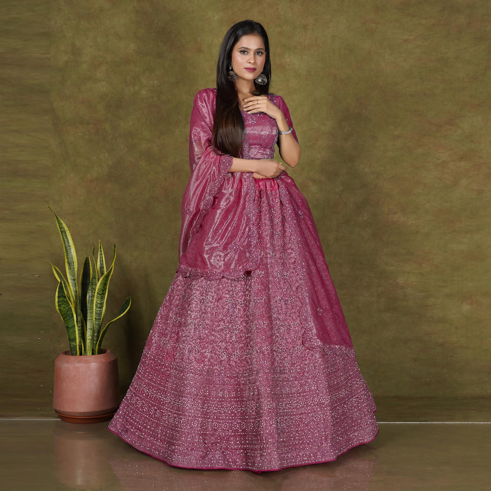 ชุดเลเฮนกาโชลีผ้าทวิลล์ปักลาย พร้อมงานปักดิ้นเลื่อมหนัก กระโปรงทรงแกรนด์ฟเลรยาวกรอมพื้น เสื้อดีไซเนอร์สำหรับงานปาร์ตี้และงานเฉลิมฉลอง