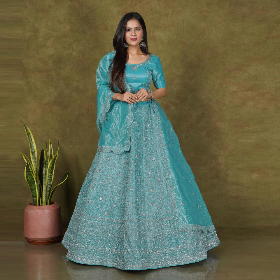 ชุดเลเฮนกาโชลีผ้าทวิลเน็ต พร้อมเสื้อปักลายละเอียดแบบมีโครงสร้าง กระโปรงทรงบาน และผ้าคลุมไหล่แบบมันเงา ดีไซน์ทันสมัย