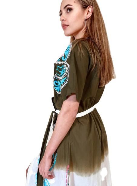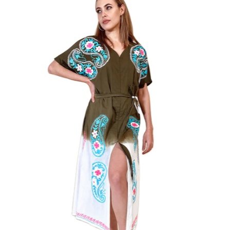 ชุดเดรสมัดย้อมปักแบบยาวพร้อมเข็มขัด,ชุดกระโปรงยาวถึงข้อเท้าแขนยาวสองสีปักลาย