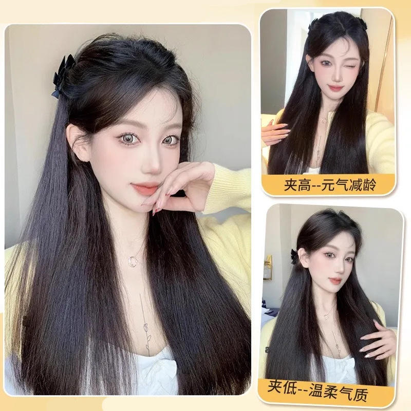 วิกผมหางม้าคู่พร้อมกิ๊บติดผมแบบโบว์ ผมยาวตรงสีดำ สำหรับทรงผมเจ้าหญิงแบบครึ่งหัว