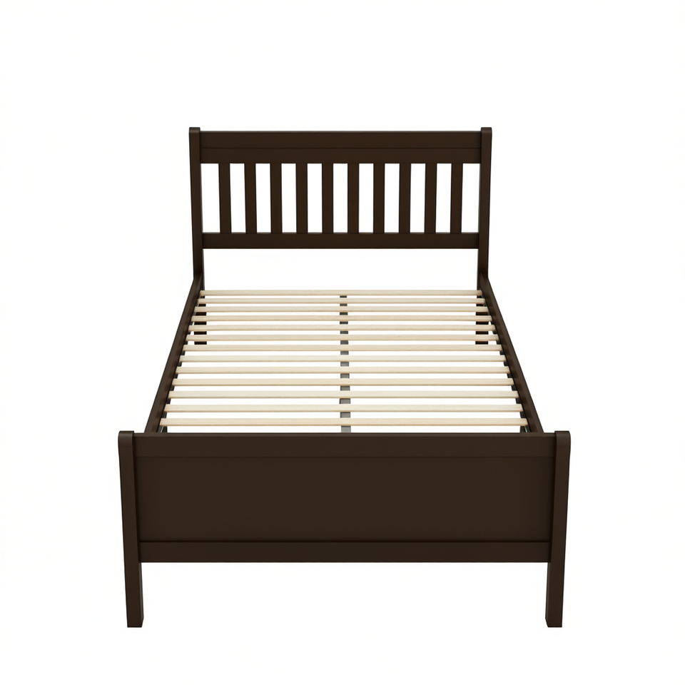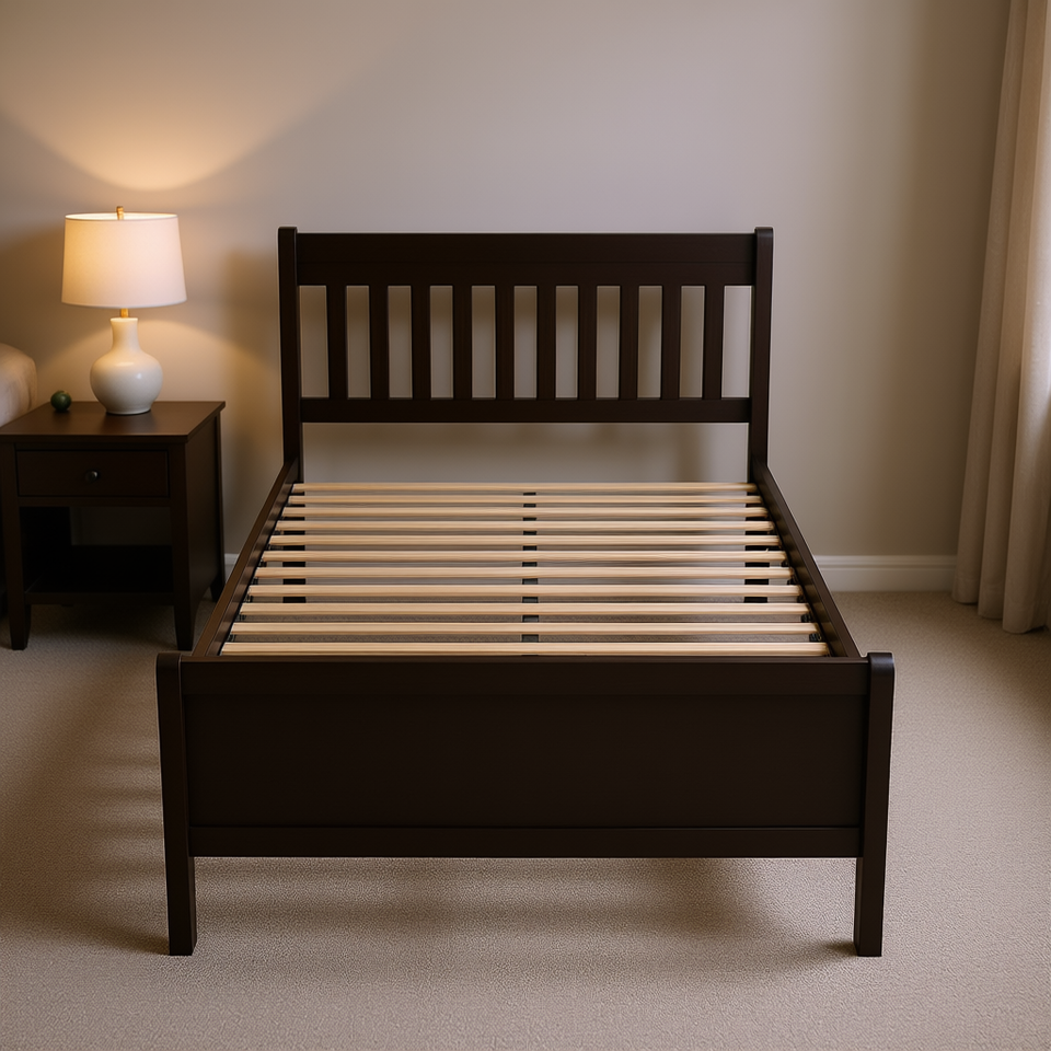 โครงเตียงคู่แบบสเลจ ทำจากไม้เนื้อแข็ง พร้อมหัวเตียงและปลายเตียง ตกแต่งสีเอสเพรสโซ โครงสร้างไม้เนื้อแข็ง สไตล์ดั้งเดิม