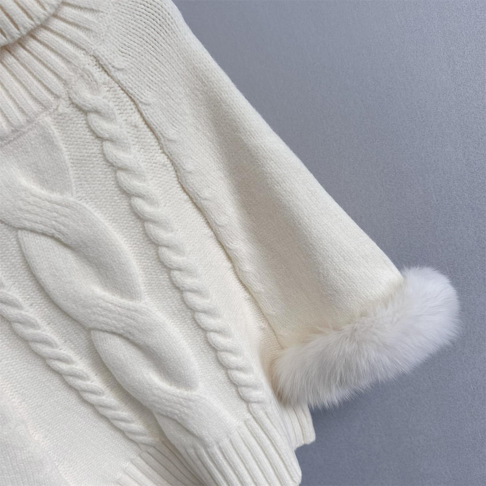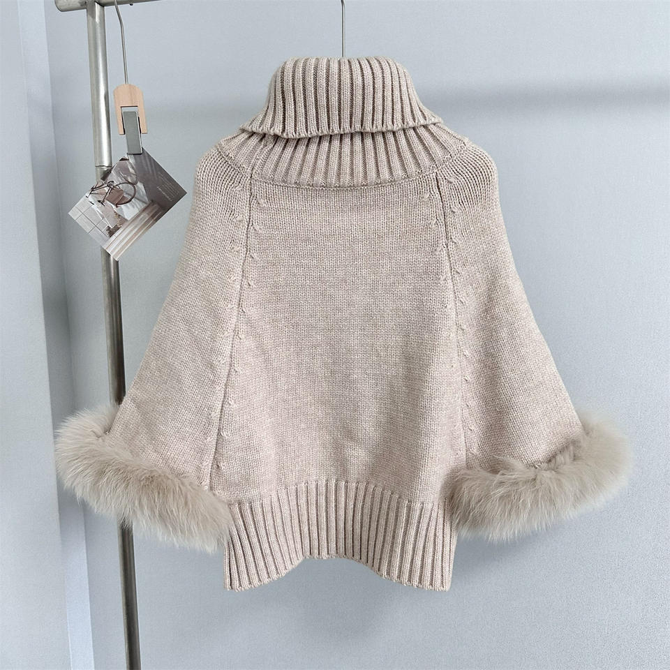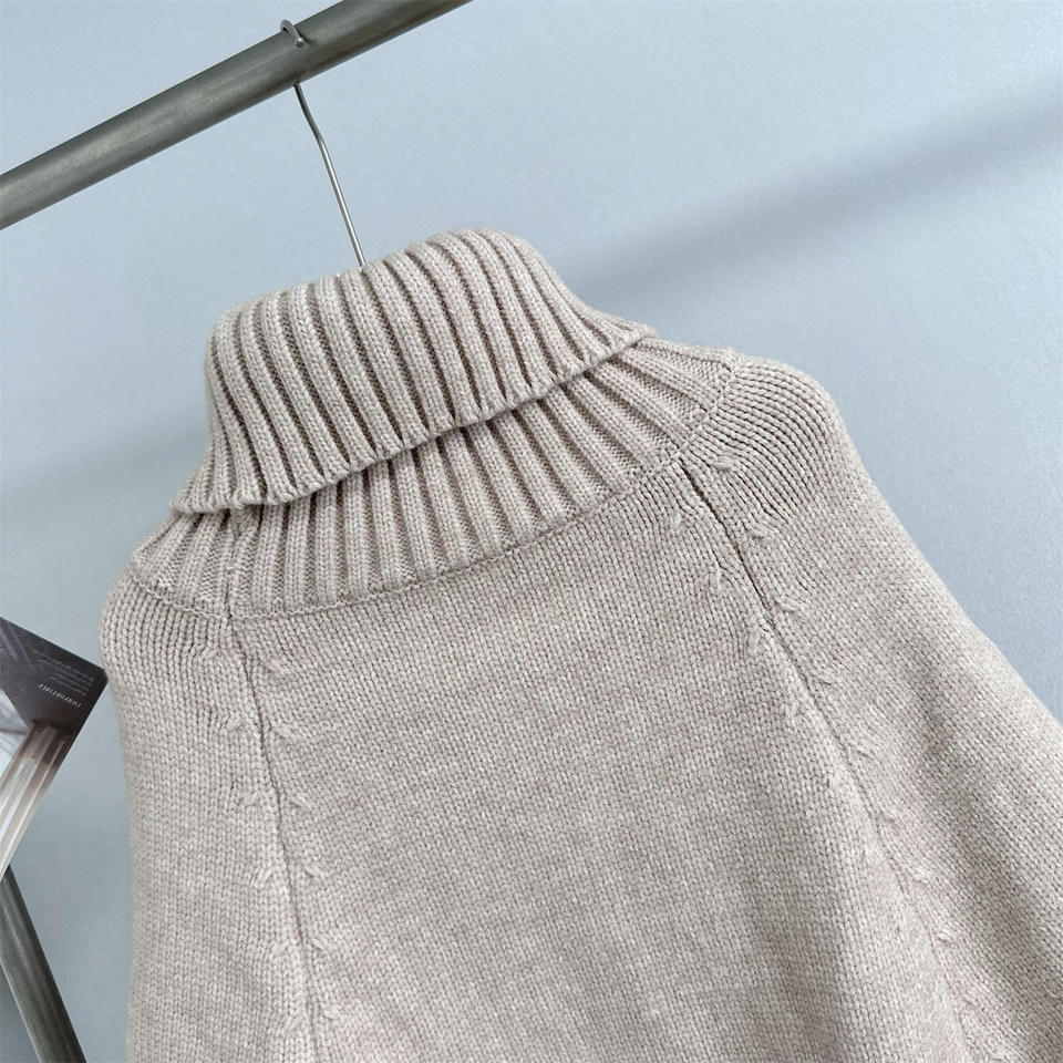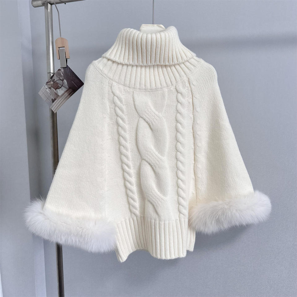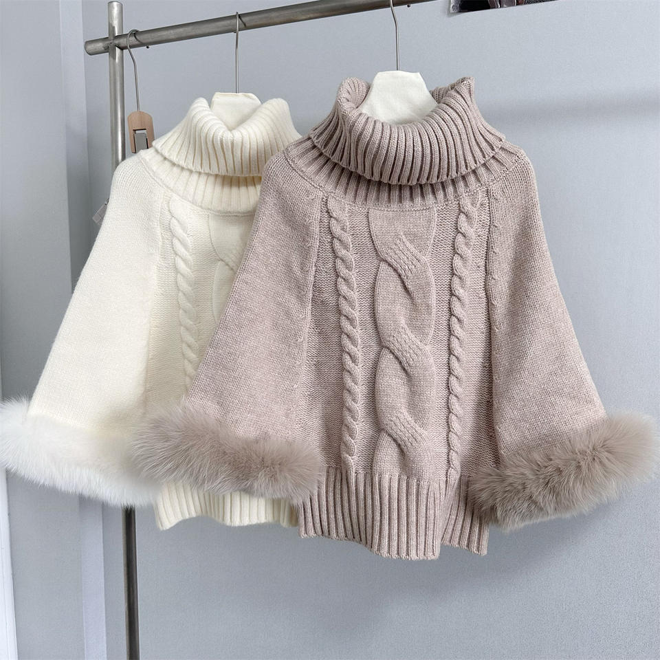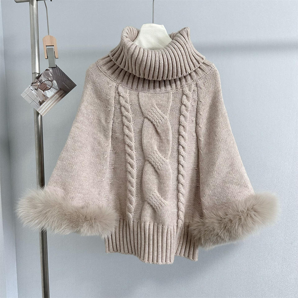 เสื้อคลุมไหมพรมถักลายบิดเกลียว คอสูงทรงหลวม แขนเสื้อแบบปะติดปะต่อขนฟูสำหรับผู้หญิง แฟชั่นเสื้อสเวตเตอร์ทรงปีกค้างคาว