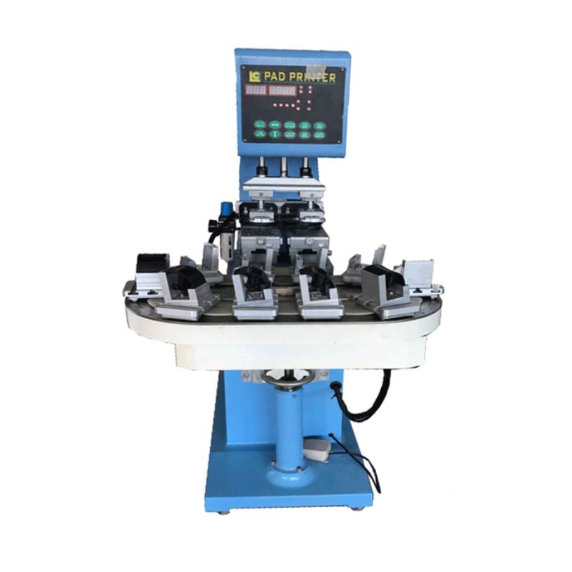 เครื่องพิมพ์แพดกึ่งอัตโนมัติสองสี พร้อมสายพานลำเลียง สำหรับหลอดไฟ LED ไฟแช็ก พัดลมดีวีดี โทรศัพท์มือถือ อุตสาหกรรมการเกษตร พร้อมปั๊มและมอเตอร์