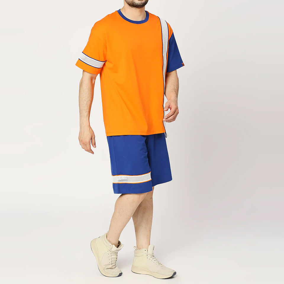 ชุดกีฬาลำลองสองชิ้นสำหรับผู้ชาย เสื้อยืดพิมพ์ลายและกางเกงขาสั้น ระบายอากาศได้ดี เหมาะสำหรับออกกำลังกาย วิ่ง และฟิตเนสในฤดูร้อน พร้อมโลโก้สีตามสั่ง