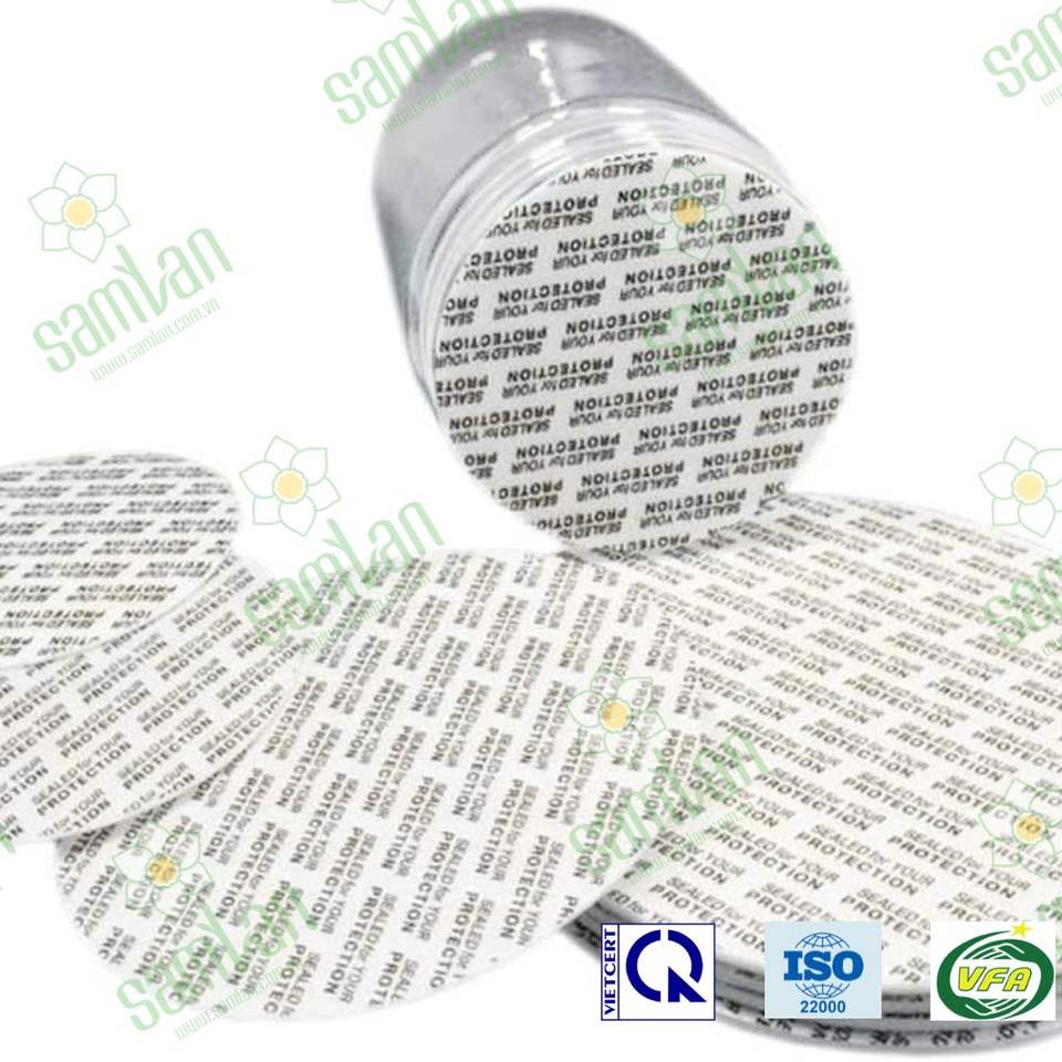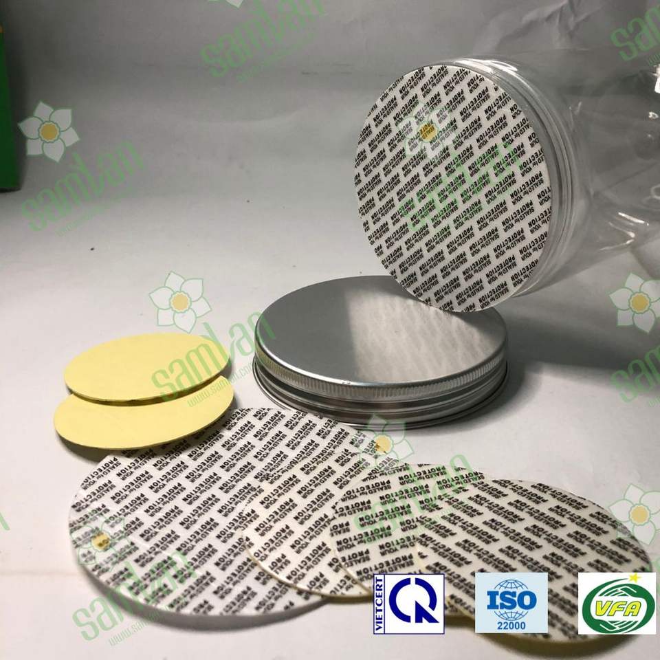 ซีลพลาสติกสองชั้นแบบเหนี่ยวนำ พร้อมแผ่นรองโฟม ปิดผนึกป้องกันการแกะ สำหรับขวดอาหาร (พิมพ์ซิลค์สกรีน) ผลิตในเวียดนาม