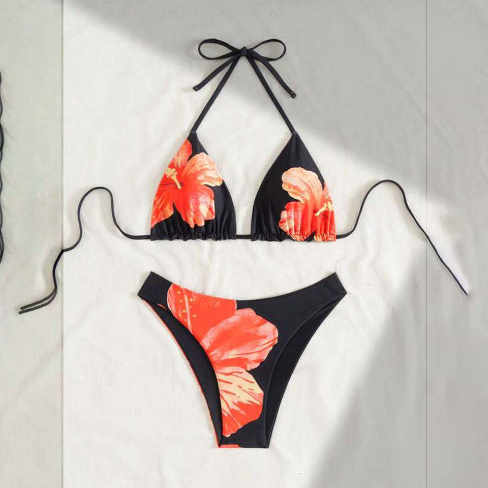 ชุดว่ายน้ำบิกินี่ลายดอกไม้สีแดงน้ำหนักเบาระบายอากาศได้ดีชุดชายหาดสำหรับผู้หญิงพิมพ์ซับลิเมชันตามสั่ง