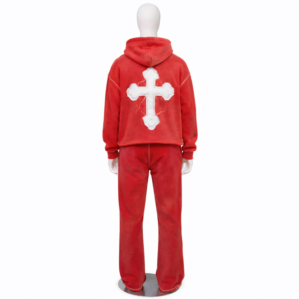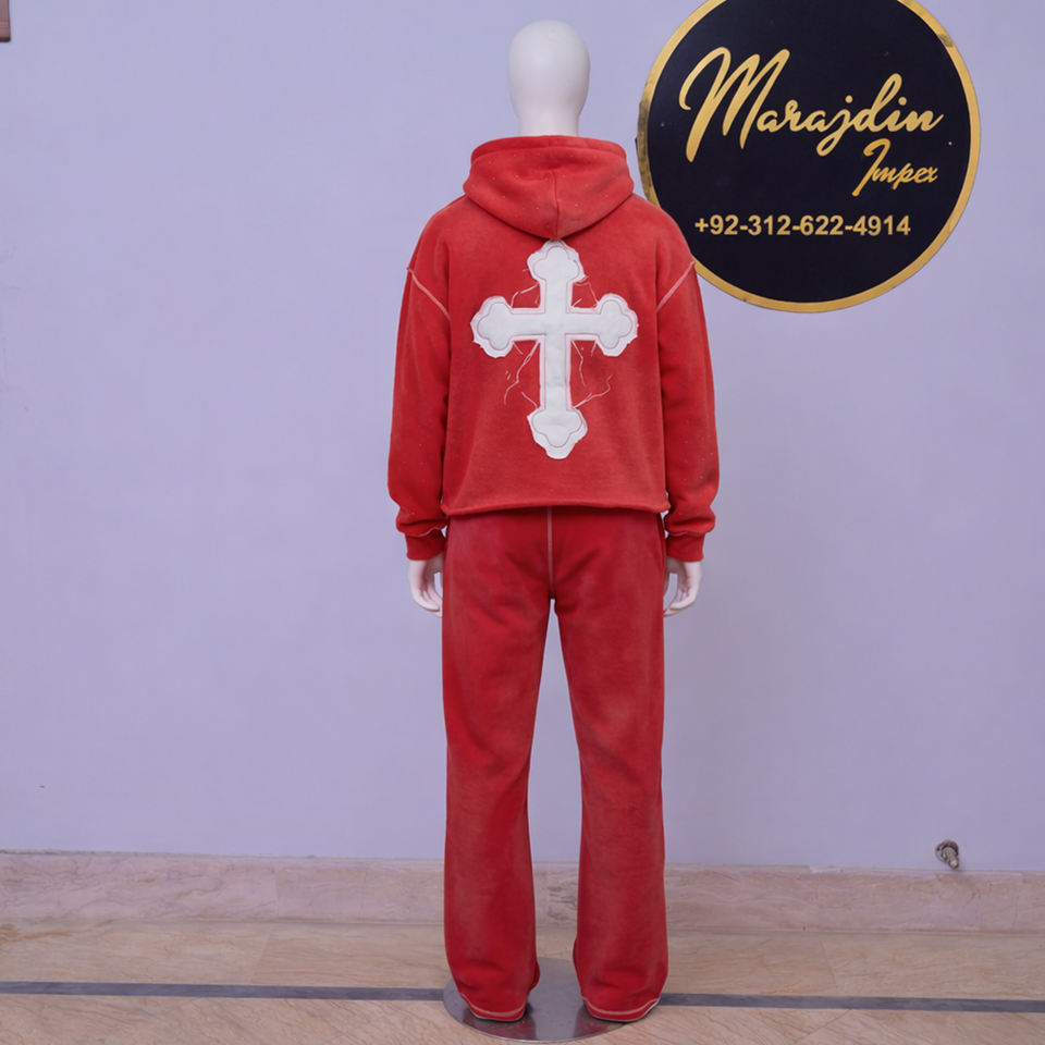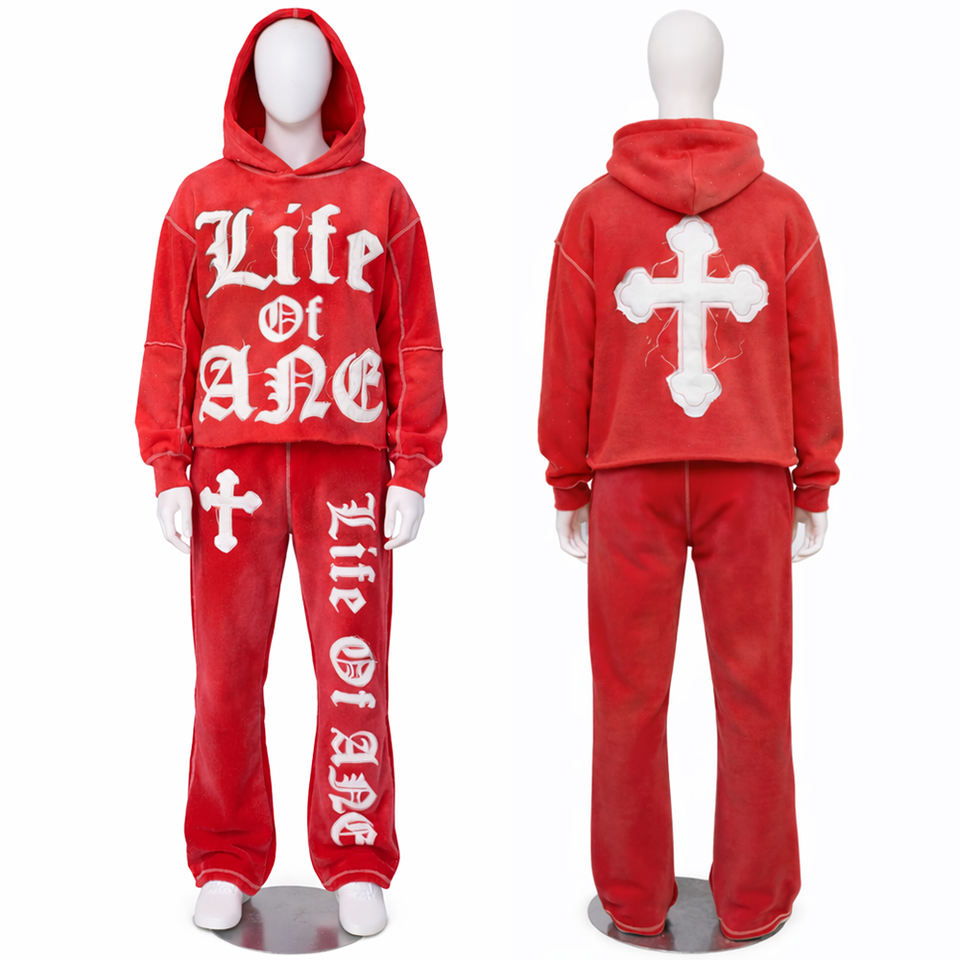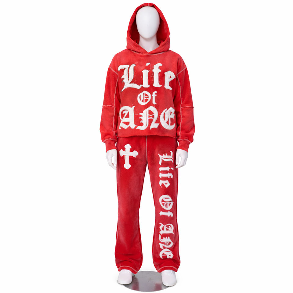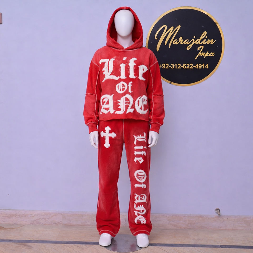 ชุดเซ็ตเสื้อฮู้ดดี้ครอปและกางเกงขายาวทรงบานผ้าฟลีซเทคนิคแบบเต็มตัวสีพื้นสำหรับฤดูหนาว พร้อมดีเทลปะติดแบบดิสเทรสและฟอกสีแบบแอซิดวอช
