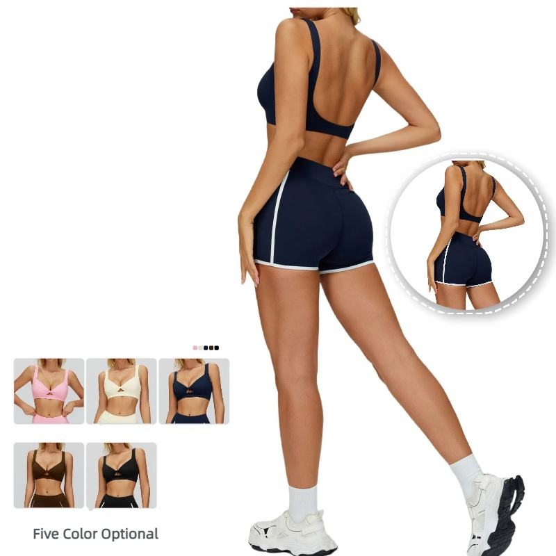 ชุดโยคะสองชิ้นสำหรับผู้หญิง เสื้อชั้นในแบบเว้าด้านหน้า กางเกงขาสั้นเอวสูงสำหรับออกกำลังกาย พร้อมผ้าที่ช่วยระบายความชื้น