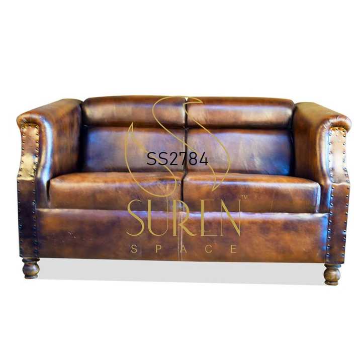 โซฟาหนังแท้สองที่นั่ง สไตล์อินเดีย วินเทจ อินดัสเทรียล ฟาร์มเฮาส์ สำหรับห้องนั่งเล่นในโรงแรม ดีไซน์เฟอร์นิเจอร์