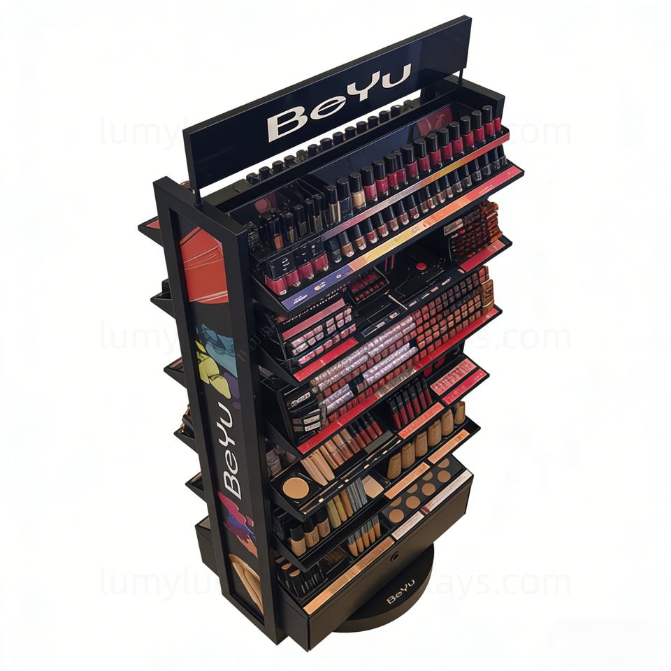 ชั้นวางสินค้าโลหะหมุนได้ 360 องศาสองด้าน พร้อมชั้นวางและลิ้นชักเก็บของ ตู้โชว์แบบตั้งพื้นสำหรับร้านขายผลิตภัณฑ์ความงาม