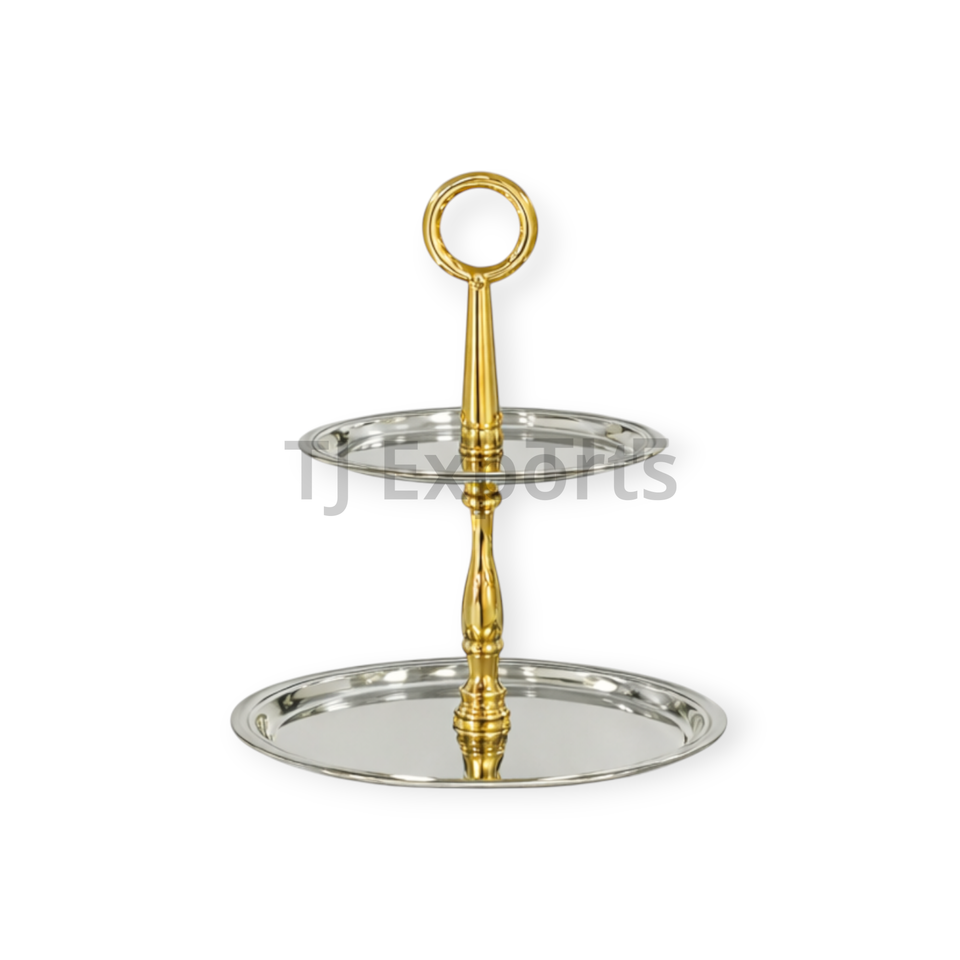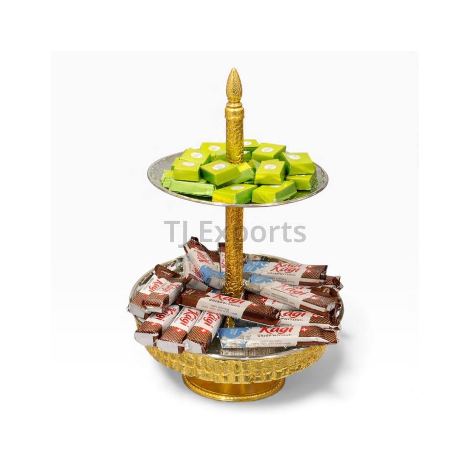 ชั้นวางขนมหวานโลหะสองชั้นพร้อมฐานสลักลายสีทองสำหรับเสิร์ฟช็อกโกแลตระดับพรีเมียมและจัดแสดงบุฟเฟ่ต์