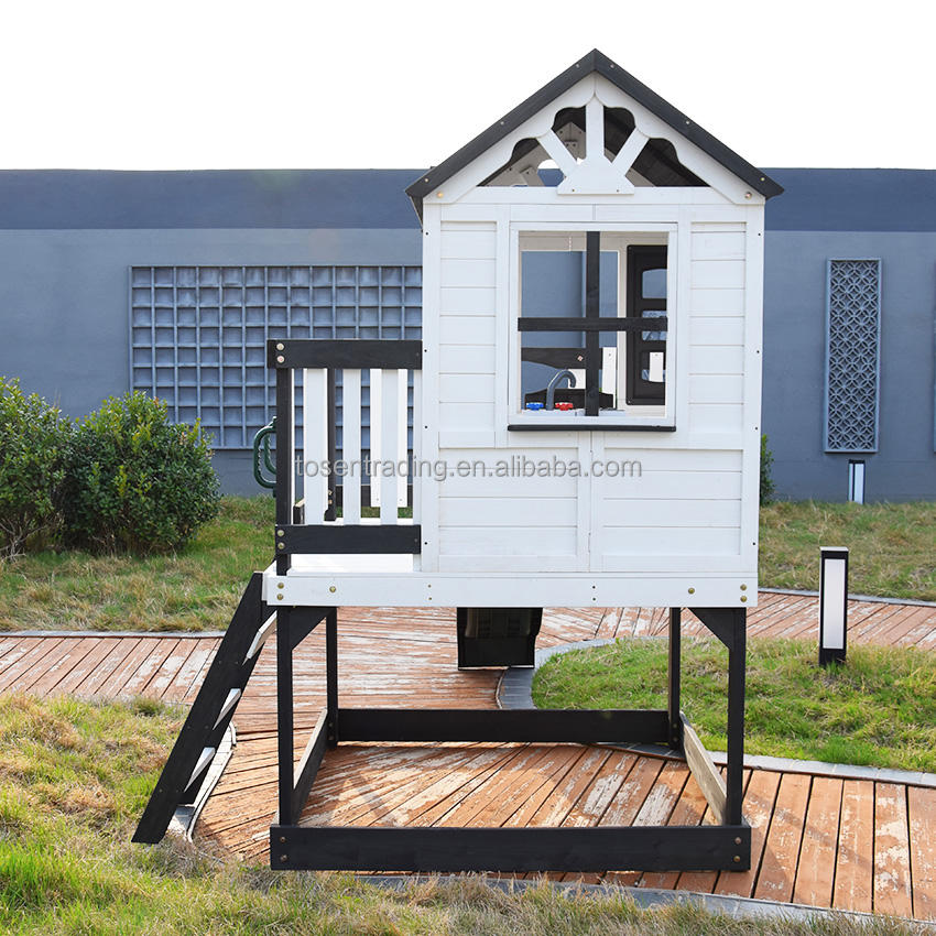 บ้านเด็กเล่นกลางแจ้งสองชั้นสีขาวดำ ทำจากไม้ เป็นมิตรกับสิ่งแวดล้อม พร้อมสไลเดอร์และราวกันตก