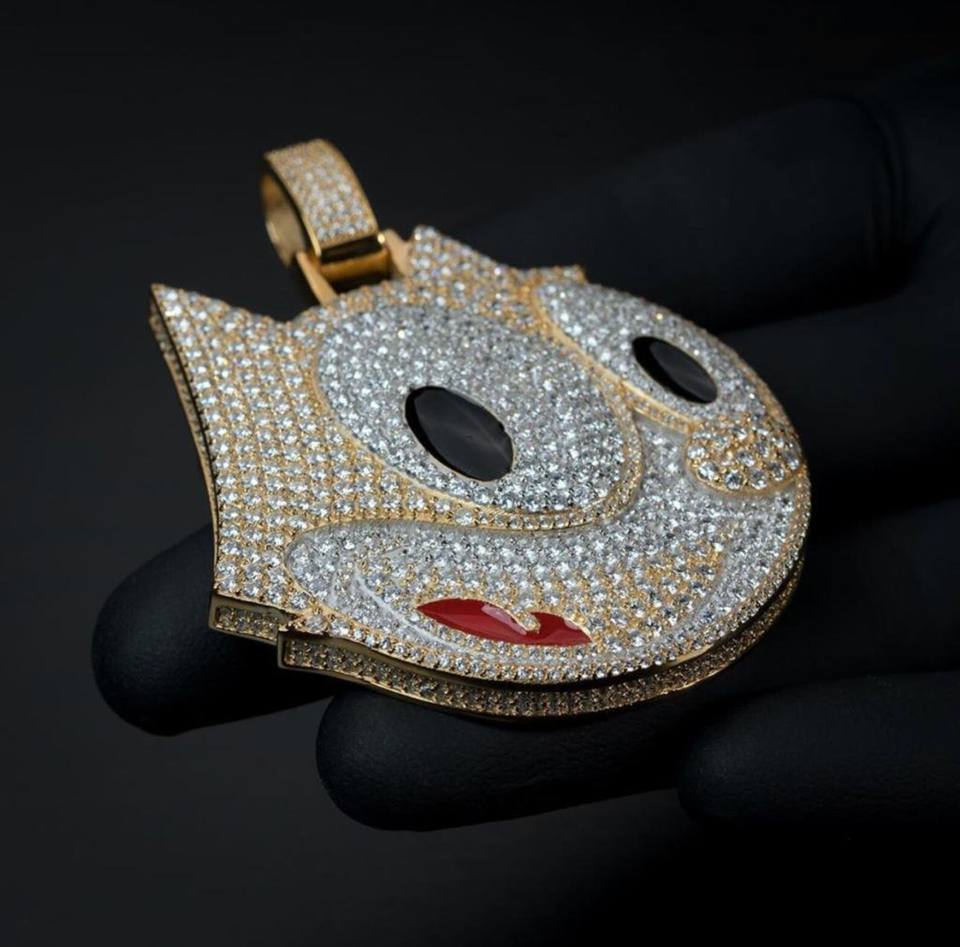 จี้รูปหน้าแมวเฟลิกซ์เคลือบสองสีโรเดียม เงินแท้ 925 ประดับเพชรโมอิสซาไนต์ เครื่องประดับฮิปฮอปสำหรับงานปาร์ตี้