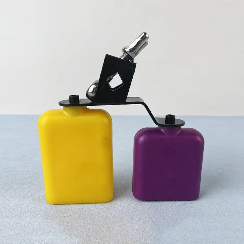 กระดิ่งวัวพลาสติกสองเสียงสูงต่ำ พร้อมบล็อกไม้สี่เหลี่ยม เชื่อมต่อกับเครื่องดนตรีออร์ฟ สำหรับประกอบดนตรีวงดนตรี