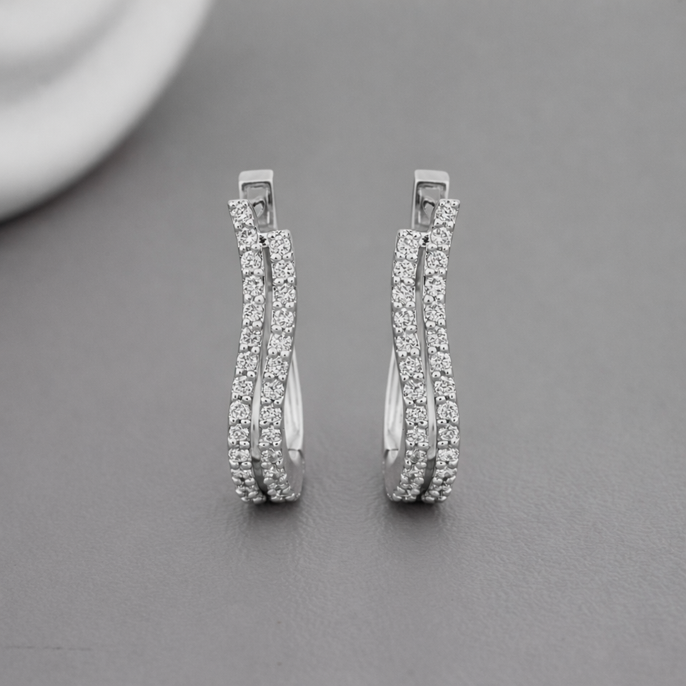 ต่างหูเพชรทรงห่วงสองสี ดีไซน์โค้งประดับเพชรแบบ Pave ชุบโรเดียม หรูหรา ได้รับการรับรองจาก IGI ทำจากเงินแท้ 925