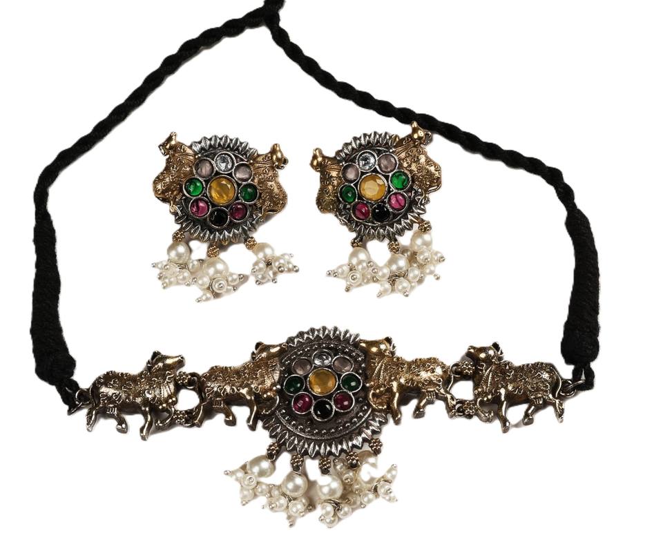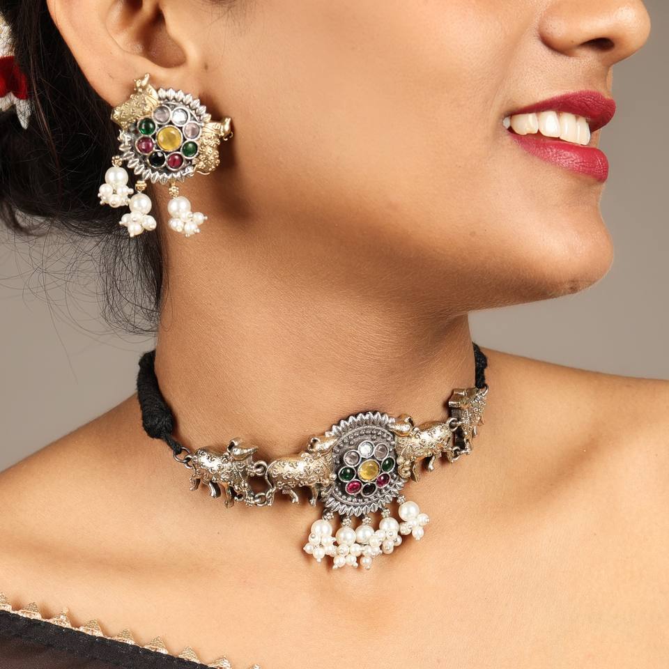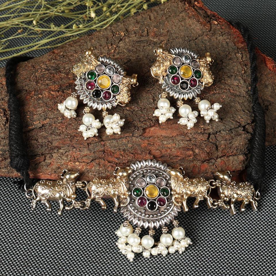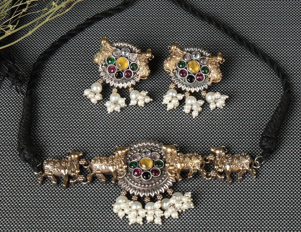 ชุดสร้อยคอเจ้าสาวลายวัวสีเงินและสีทองแบบสองสี ประดับด้วยหินหลากสีและมุกทรงหยดน้ำ เครื่องประดับงานแต่งงานแบบดั้งเดิม