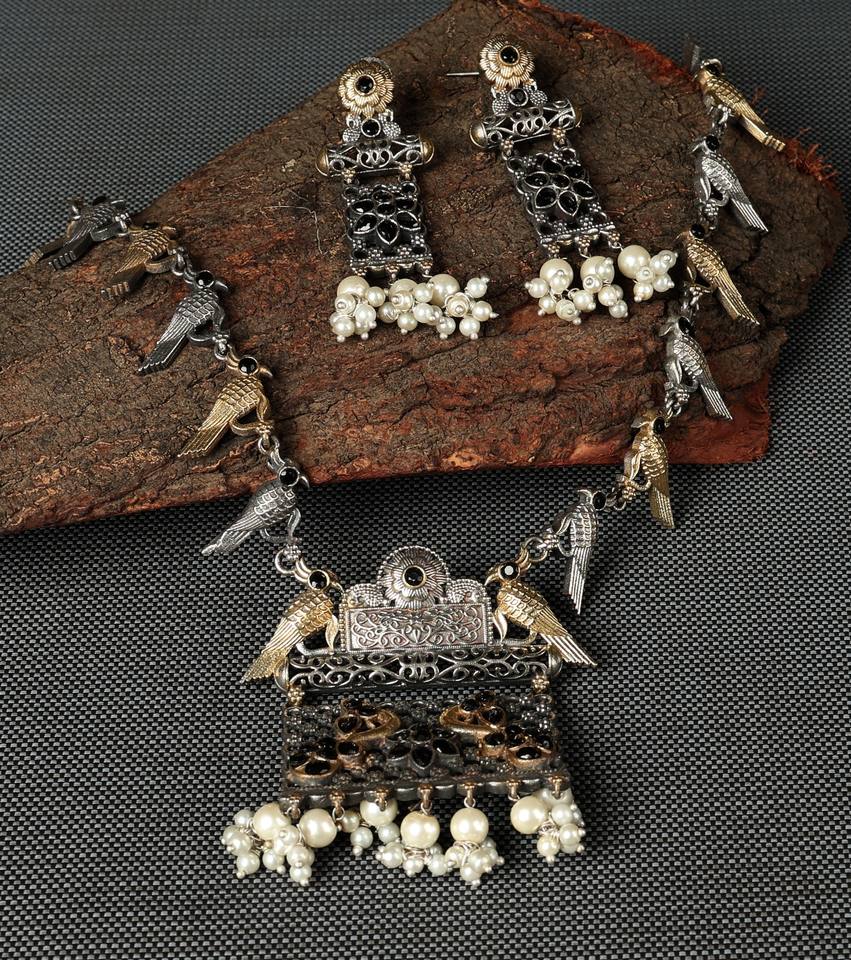 Two Tone Oxidized Silver and Gold Flower Motif Bohemian Bridal Necklace Earring Set for Wedding & Engagement Gift