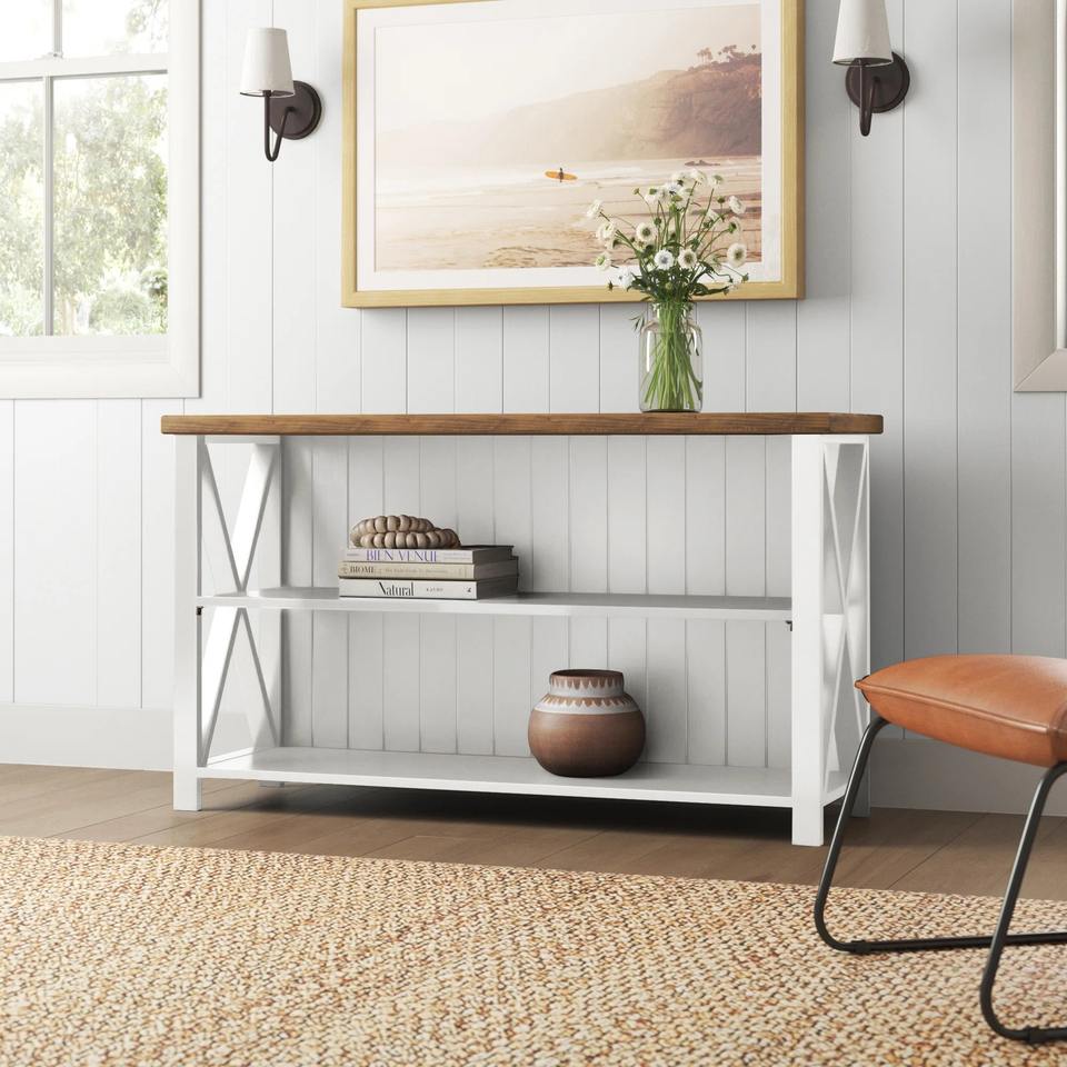 โต๊ะโซฟาไม้สองสี ดีไซน์บอร์ดไม้ลูกปัดด้านหลัง พร้อมชั้นวางของ เฟอร์นิเจอร์ทางเข้าบ้านสไตล์คอสตัลโคทเทจ