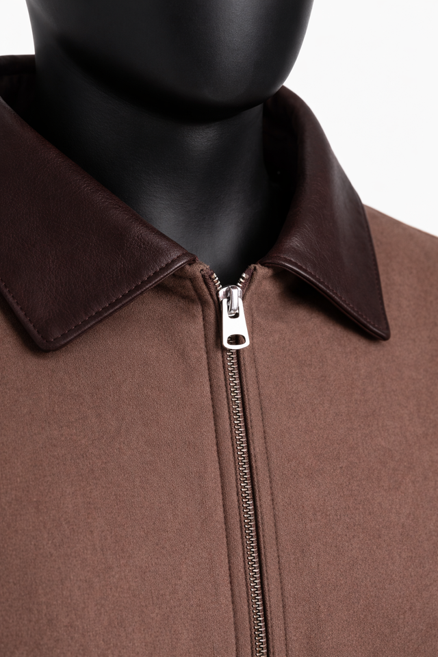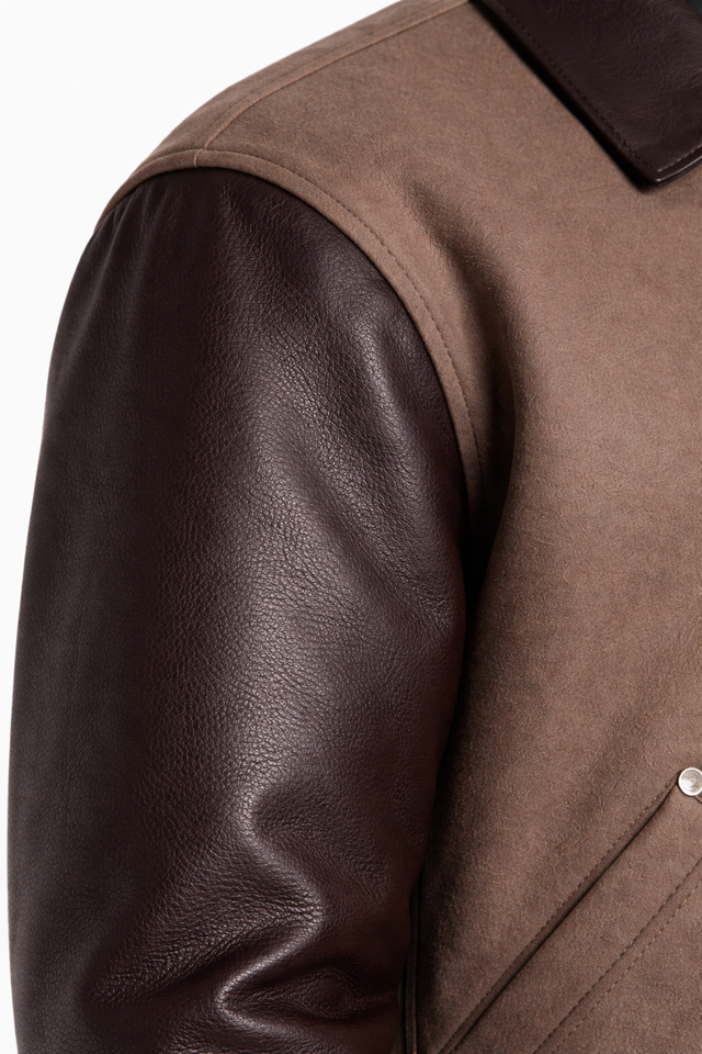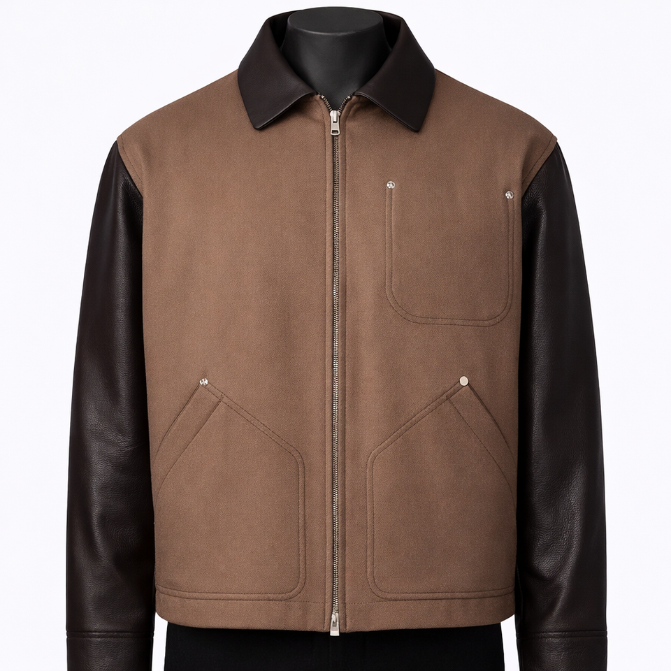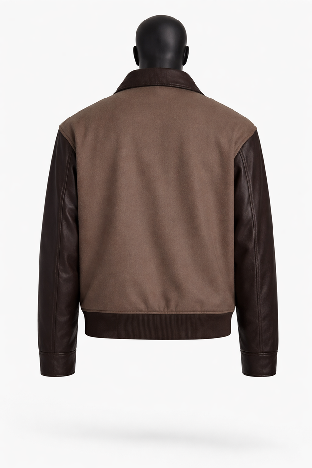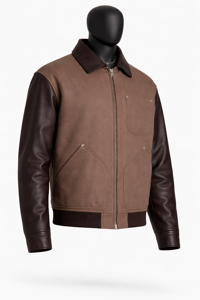 เสื้อแจ็คเก็ตบอมเบอร์ผ้าวูลผสมสองสี แขนหนังเทียม สไตล์ลำลอง ซิปหน้า เสื้อคลุมแนวสตรีท