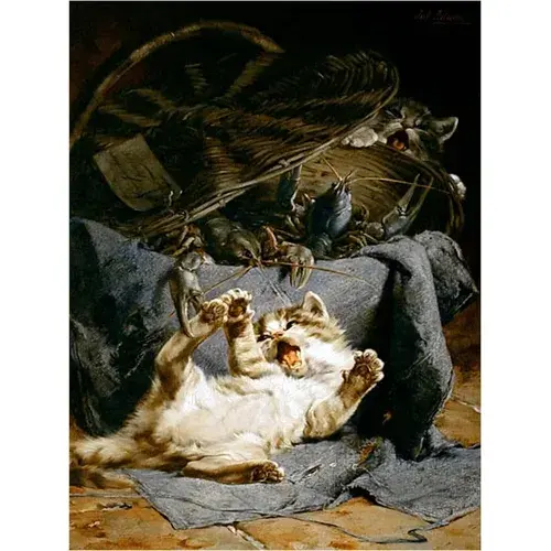 แมวสองคนเล่นกับภาพจิตรกรรมฝาผนังกระเบื้องกุ้งบุผนังห้องครัว