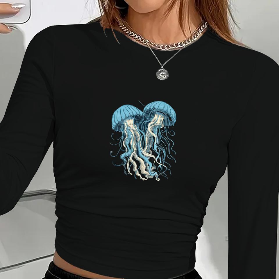 เสื้อแขนยาวลายแมงกะพรุนสำหรับผู้หญิงสองตัวที่วาดอย่างประณีต