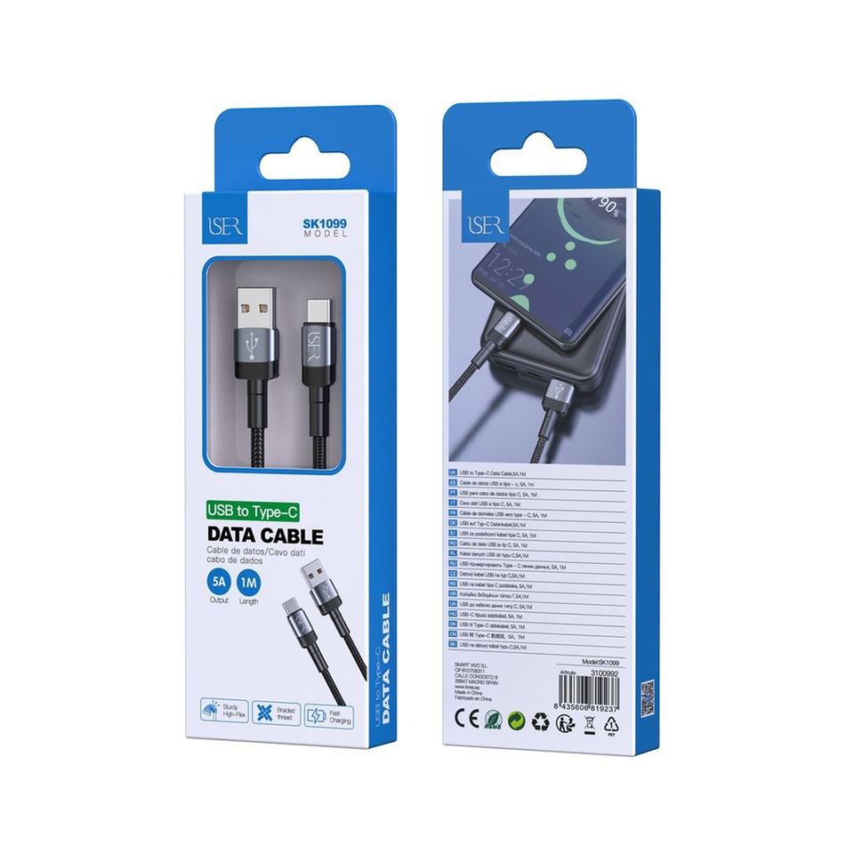 Type-C 5A 1M Black Braided Cable - High-Efficiency Charger for Devices