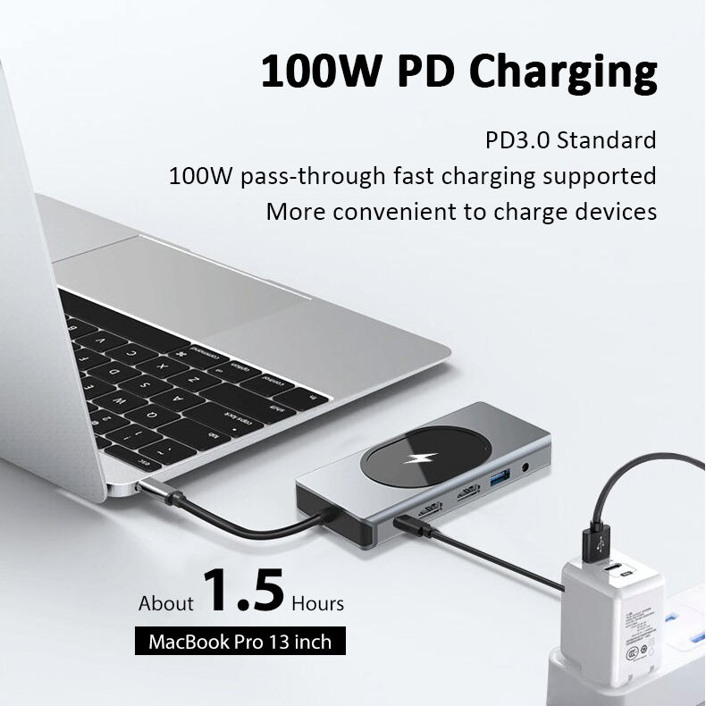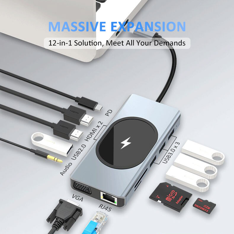 อะแดปเตอร์ Type C Hub Ethernet,แท่นชาร์จแล็ปท็อปแบบไร้สาย15W มีพอร์ต Usb C พอร์ตคู่ HDTV MI VGA สามจอและแท่นชาร์จ USB 3.0