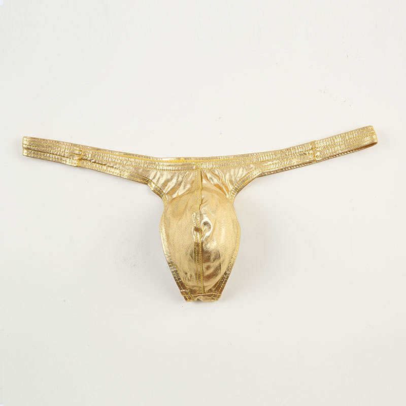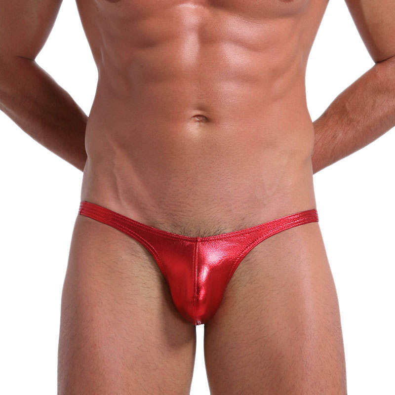กางเกงในชายแบบจีสตริงทรง U โค้งเว้าขนาดใหญ่ ผลิตจากหนังแก้วเงา เย็บสองชั้นอย่างประณีต ชุดว่ายน้ำชาย