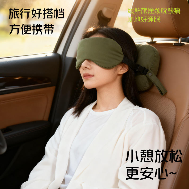 หมอนเมมโมรี่โฟมรูปตัวยูพร้อมหน้ากากปิดตาแบบพกพาสำหรับรองรับคอสำหรับการเดินทางและการงีบหลับในสำนักงานสีเขียวเข้มสีทึบ