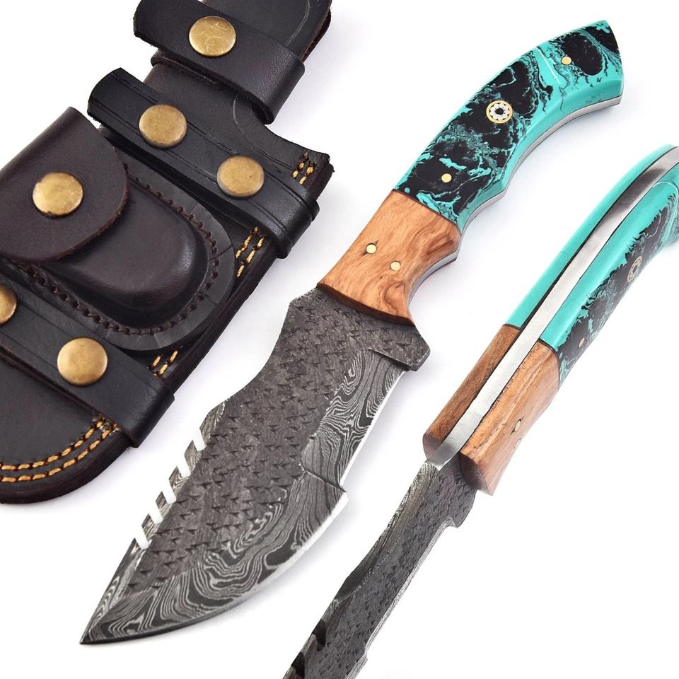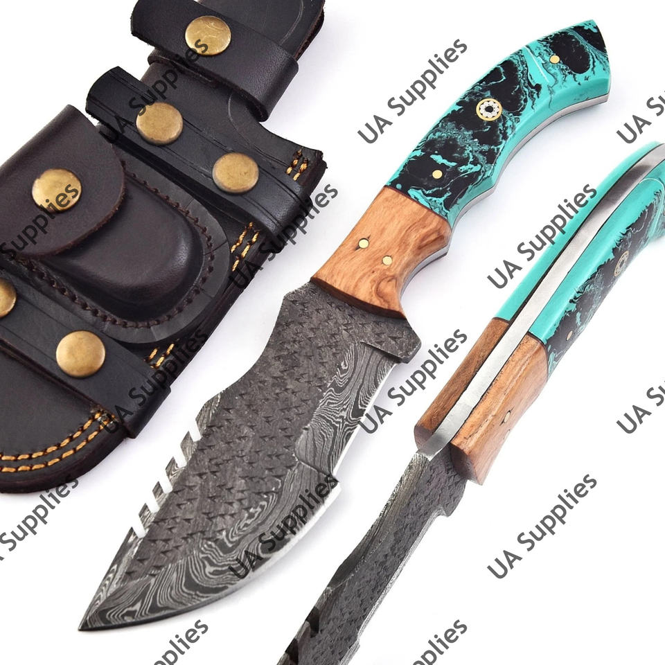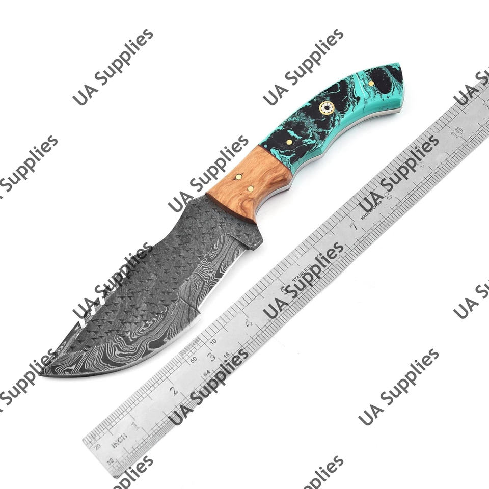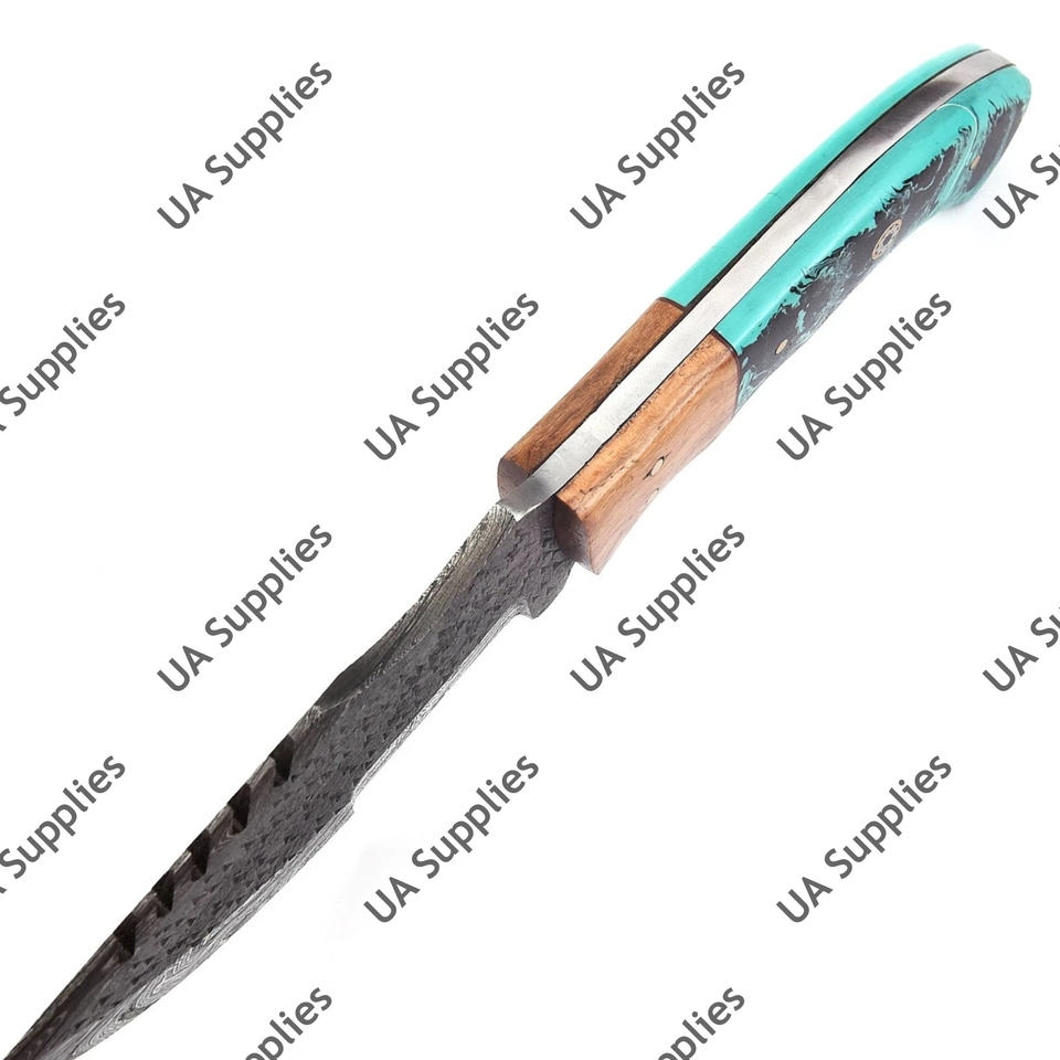 UA Supplies มีดใบเหล็กดามัสกัสแบบตีลาย ด้ามจับแบบเต็มด้าม สำหรับล่าสัตว์ กิจกรรมกลางแจ้ง เอาตัวรอดในป่า บุชคราฟท์ และตั้งแคมป์