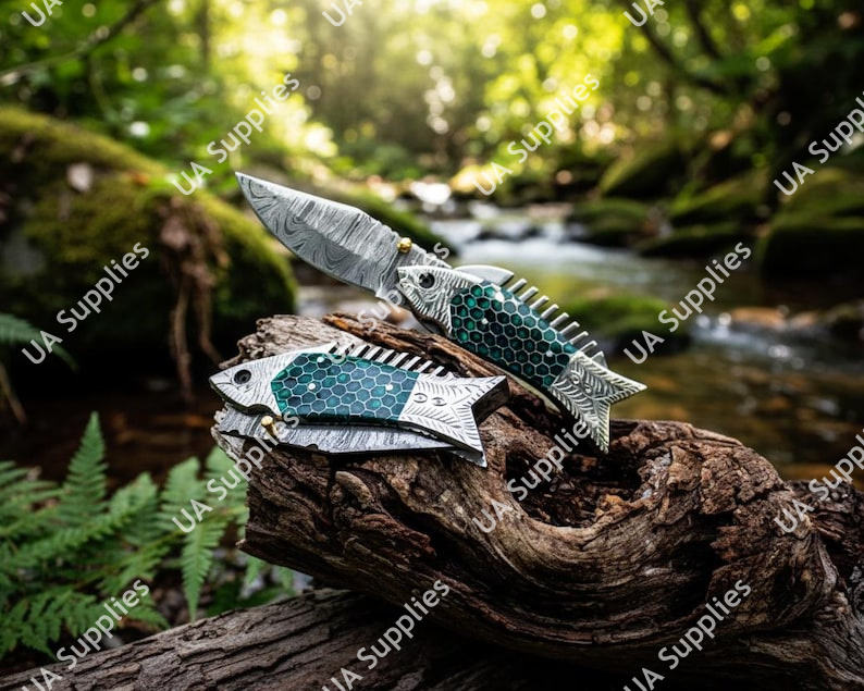 Handmade Damascus Fish Folding Knife