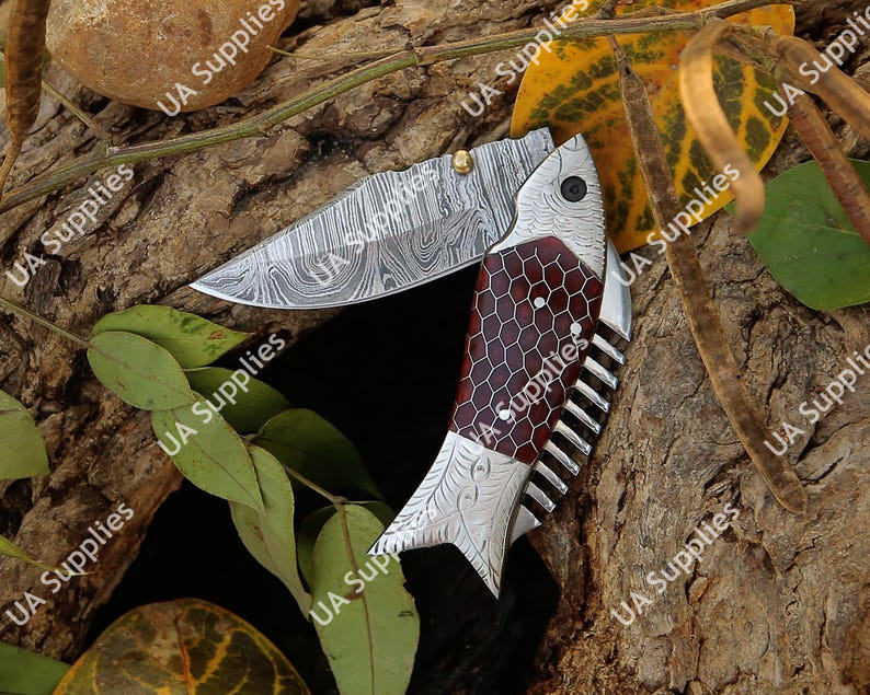 Handmade Damascus Fish Folding Knife